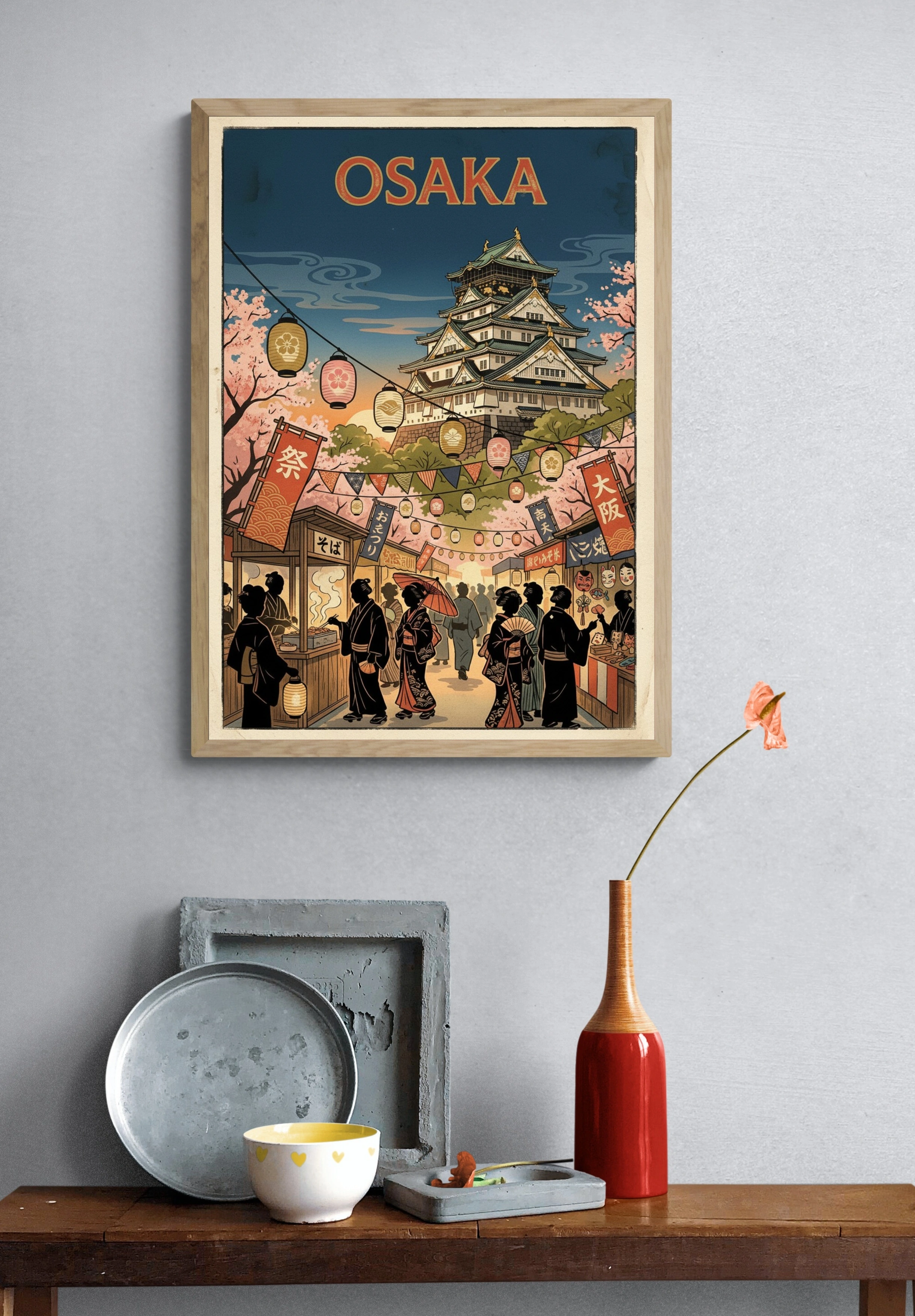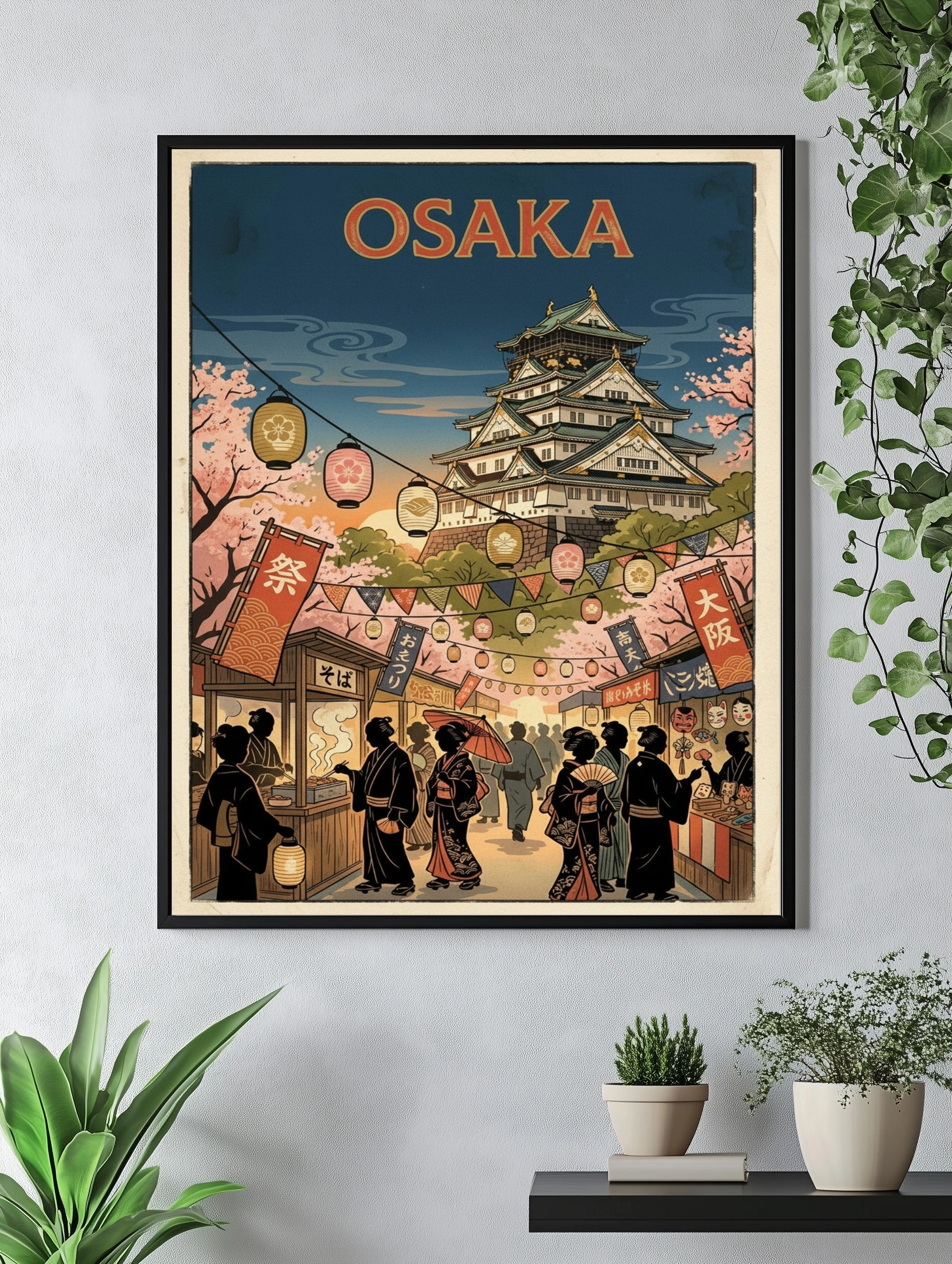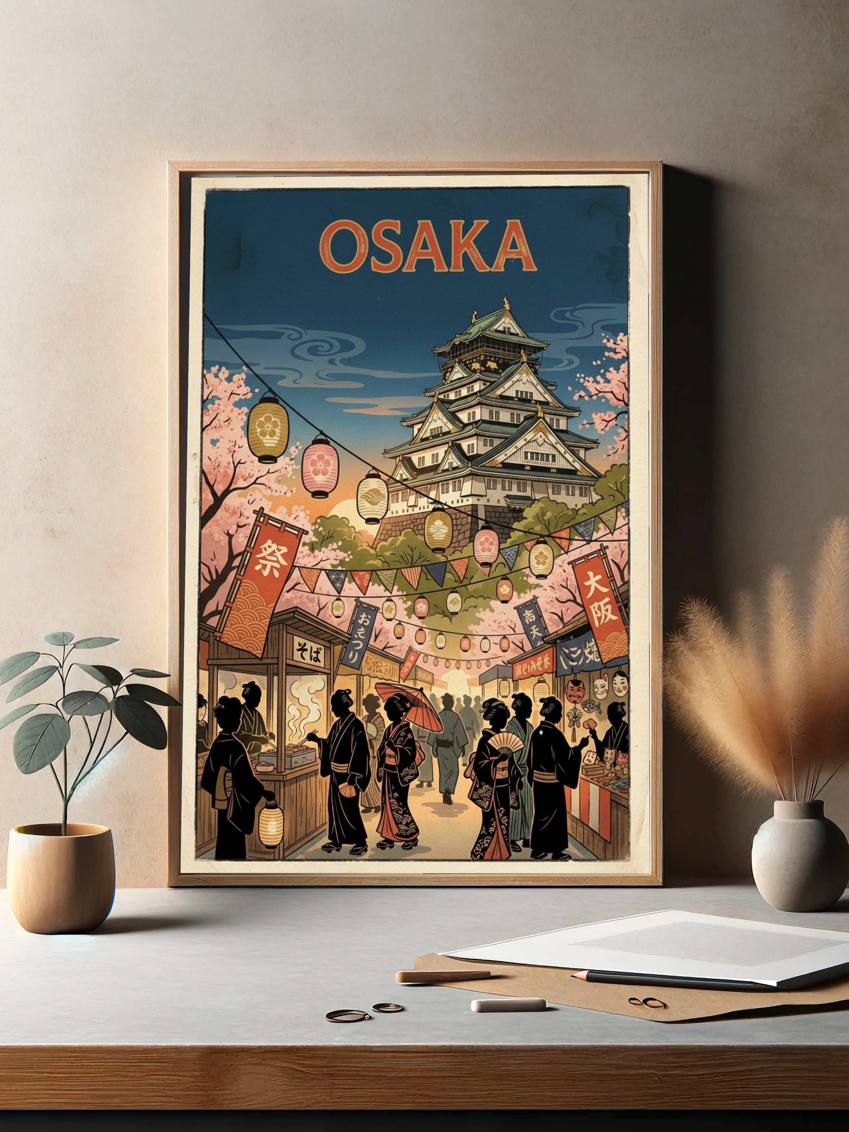 Погрузитесь в атмосферу волшебного вечера в Осаке с этим потрясающим постером! На переднем плане изображены элегантные женщины в кимоно, прогуливающиеся по яркому рынку, где повсюду висят традиционные японские фонари. Вдалеке величественно возвышается замок Осаки, окружённый цветущими сакурами, создавая идеальный фон для этого живописного пейзажа. Яркие вывески с надписями на японском языке добавляют аутентичности, а теплые оттенки розового и оранжевого создают уютную атмосферу. Этот постер станет отличным акцентом в вашем интерьере, будь то гостиная, спальня или офис, и привлечёт внимание всех, кто ценит японскую культуру и искусство. Идеально подходит для молодежи, семей и креативщиков, желающих добавить яркие эмоции в своё пространство.