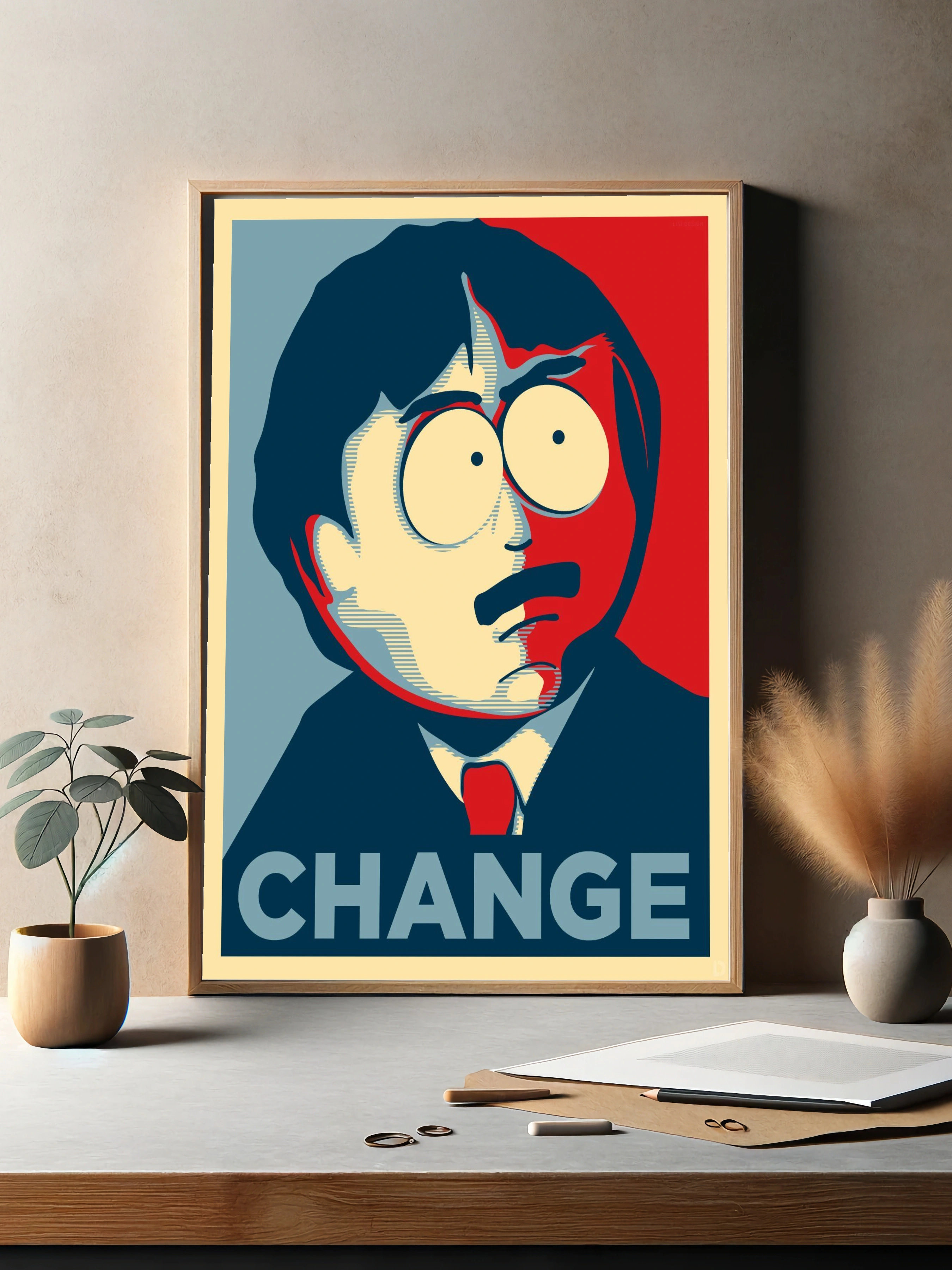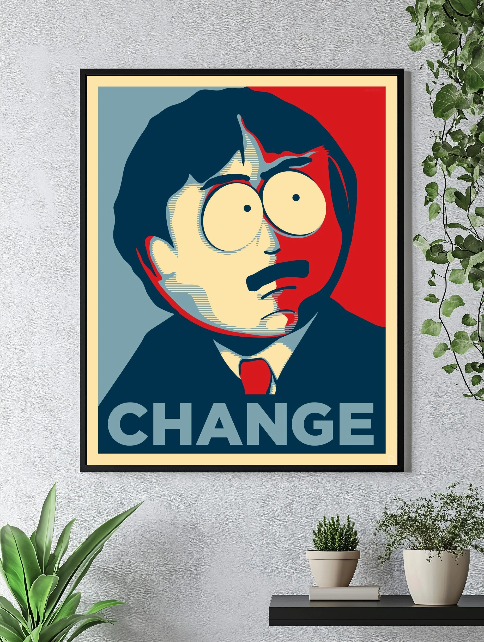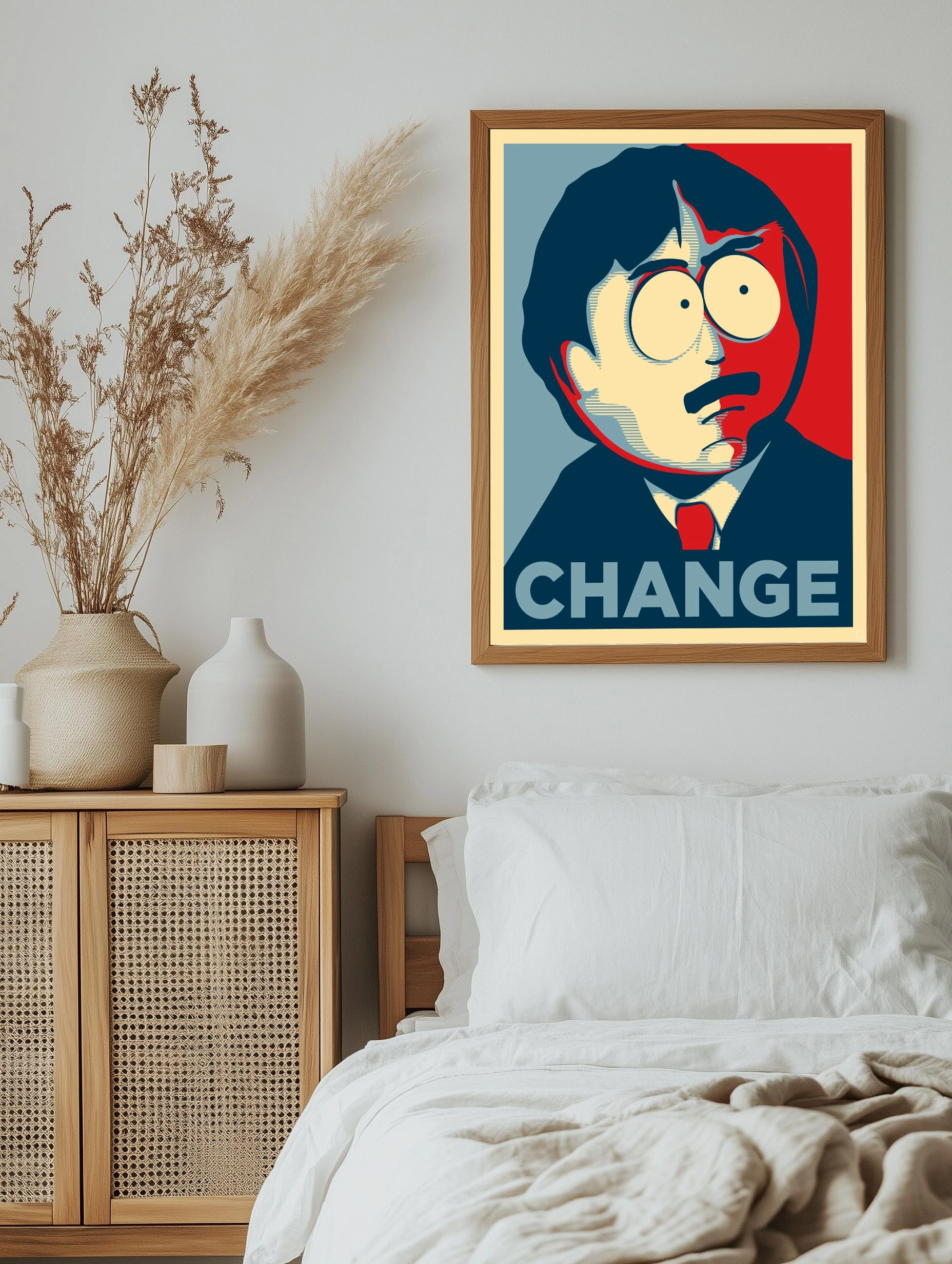 Яркое изображение персонажа из популярного мультсериала, выполненное в стиле Хоуп с яркими контрастами красного, синего и бежевого цветов. Динамичное выражение лица и текст «CHANGE» создают энергичное настроение. Этот интерьерный художественный плакат эффектно дополнит современный декор гостиной или офиса.