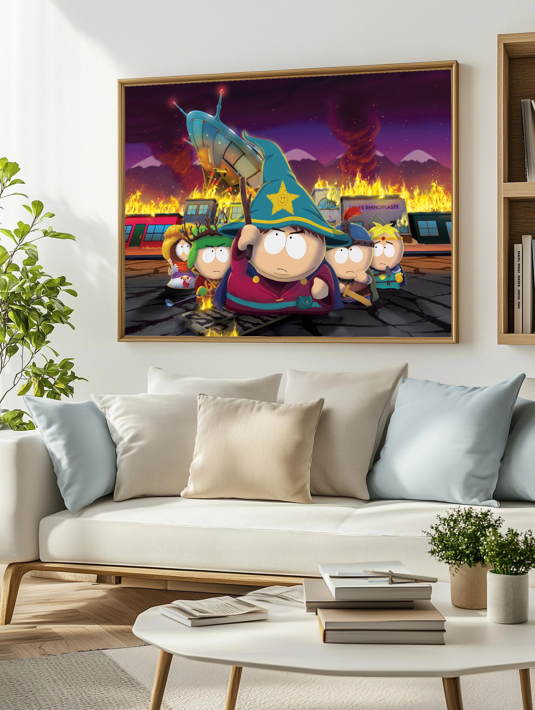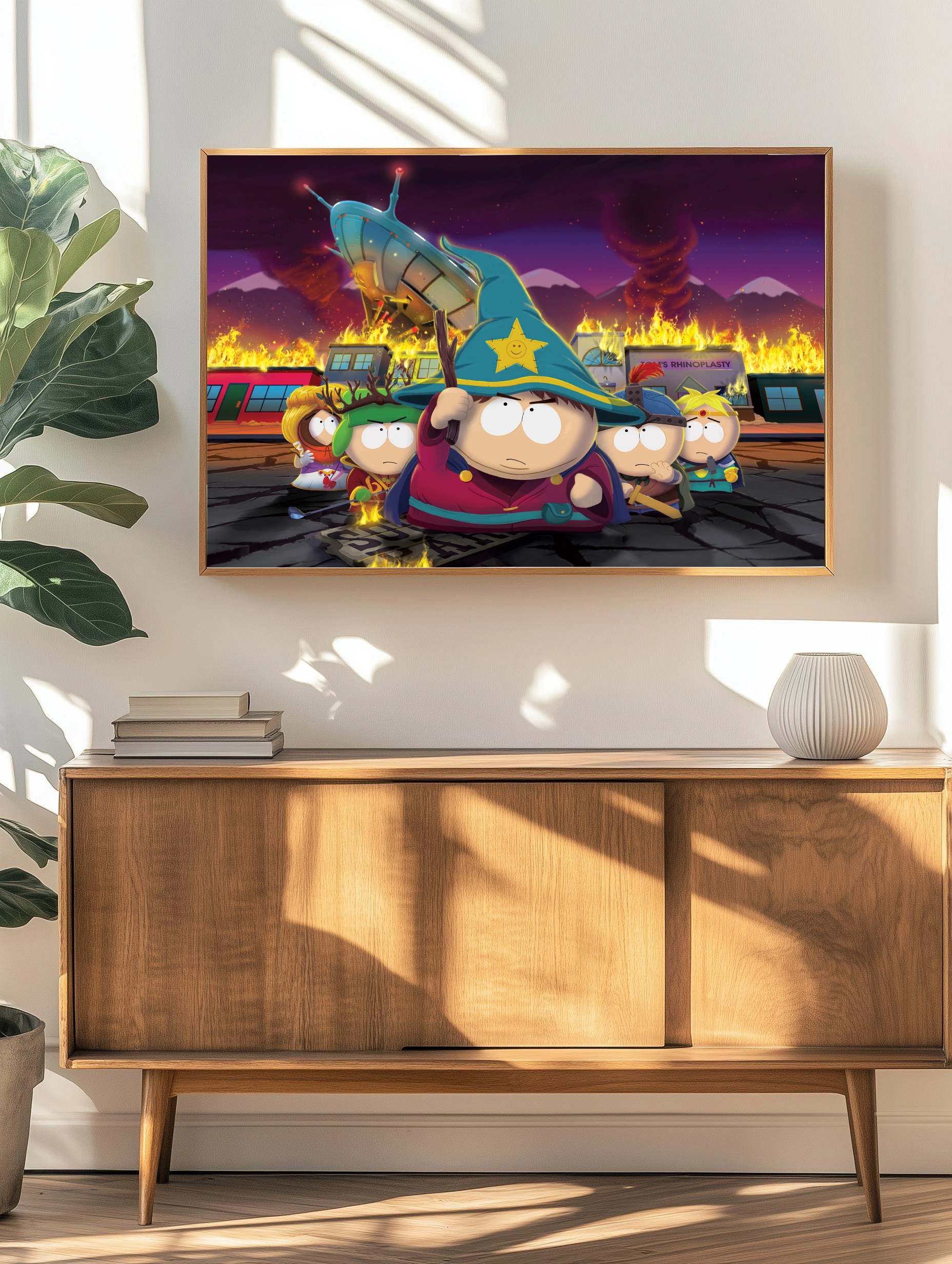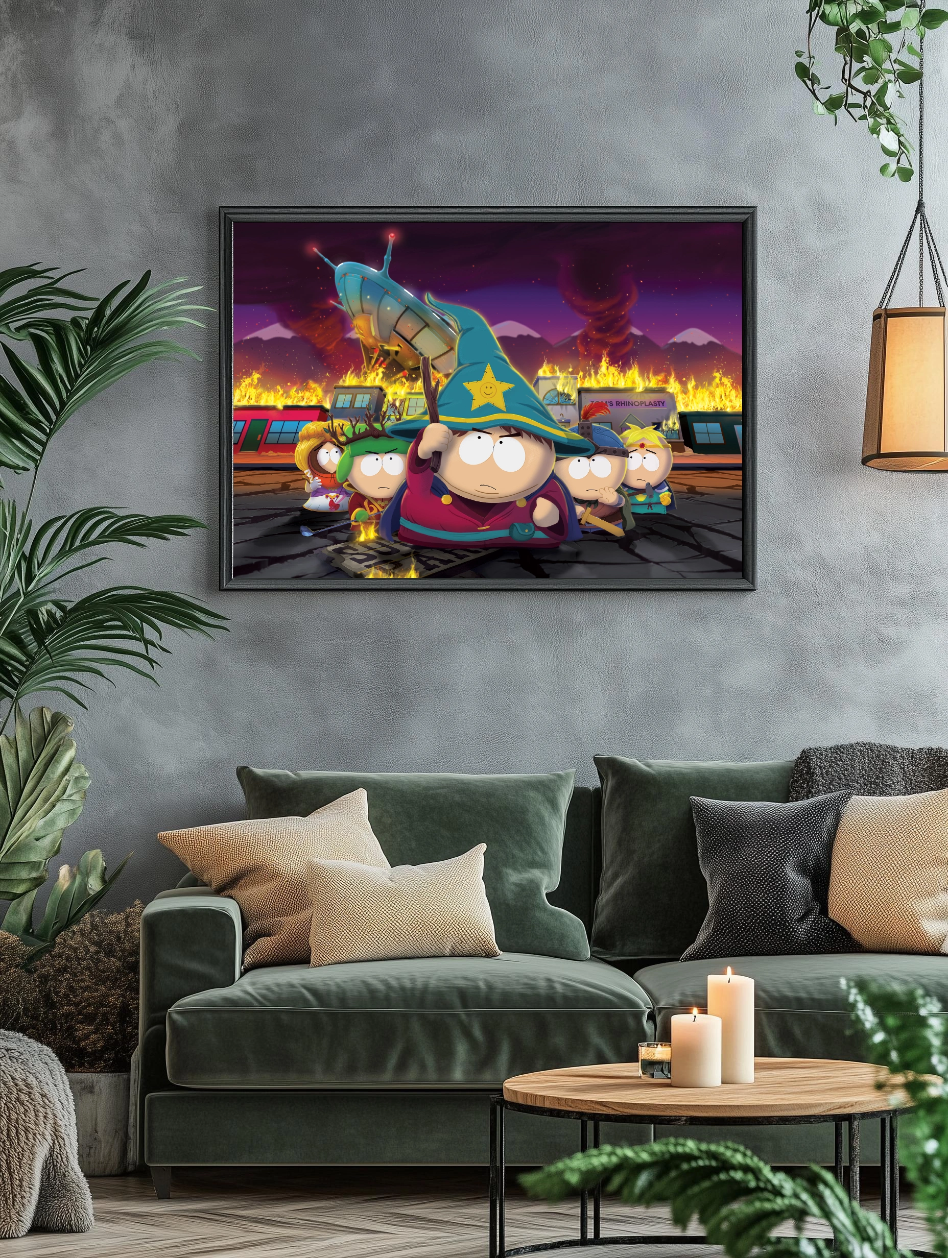 Изображение из знаменитого мультсериала Южный Парк показывает главных персонажей, одетых в фэнтезийные костюмы, на фоне горящего города и космического корабля. Картина для гостиной и спальни, объединяющая элементы современного искусства для стен и стильного декора. Пламенный и мистический сюжет создает динамичное настроение.
