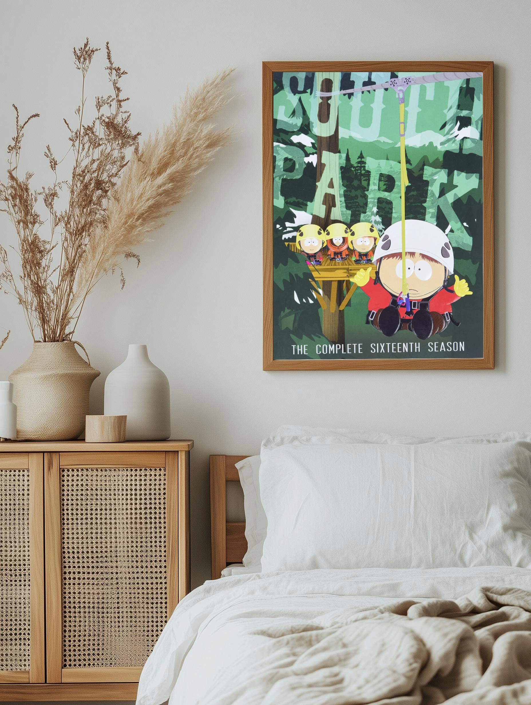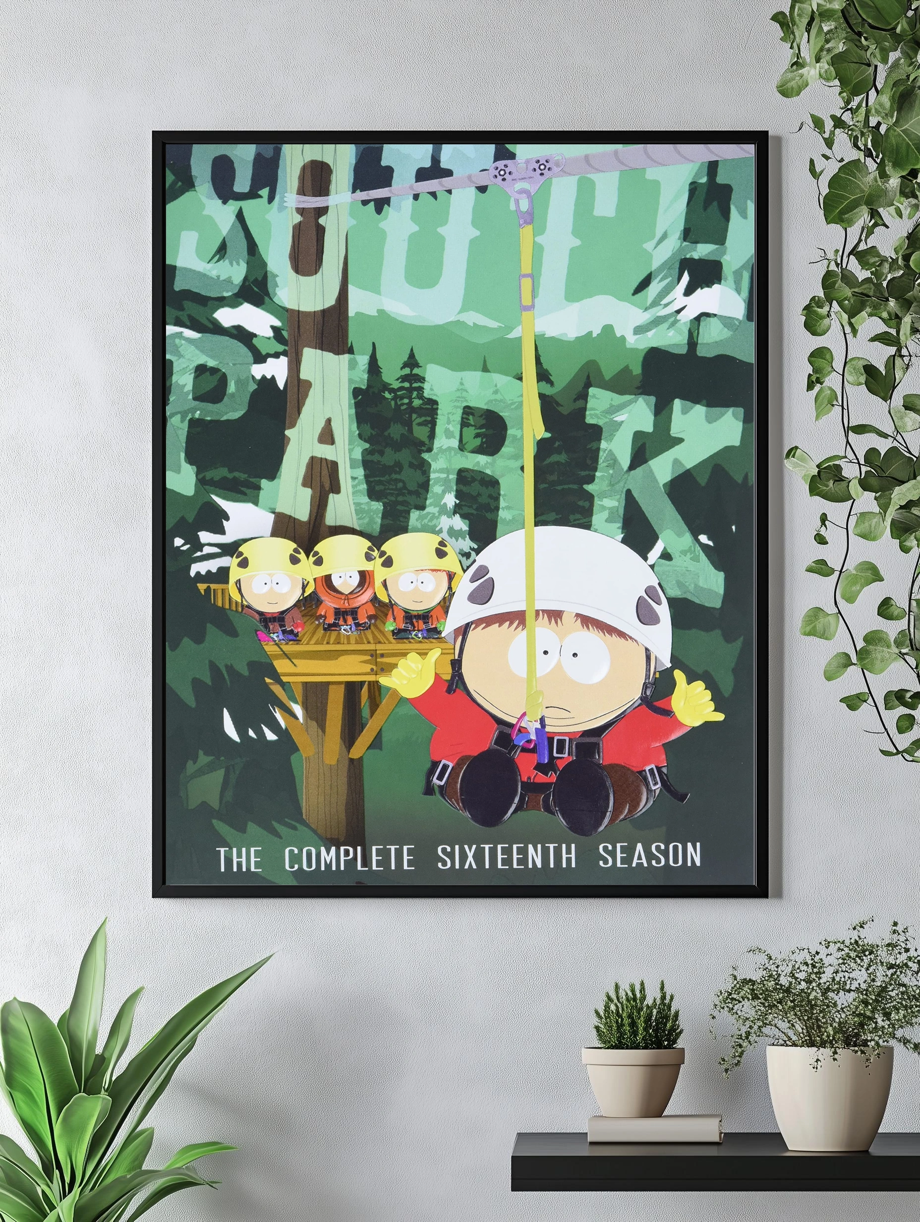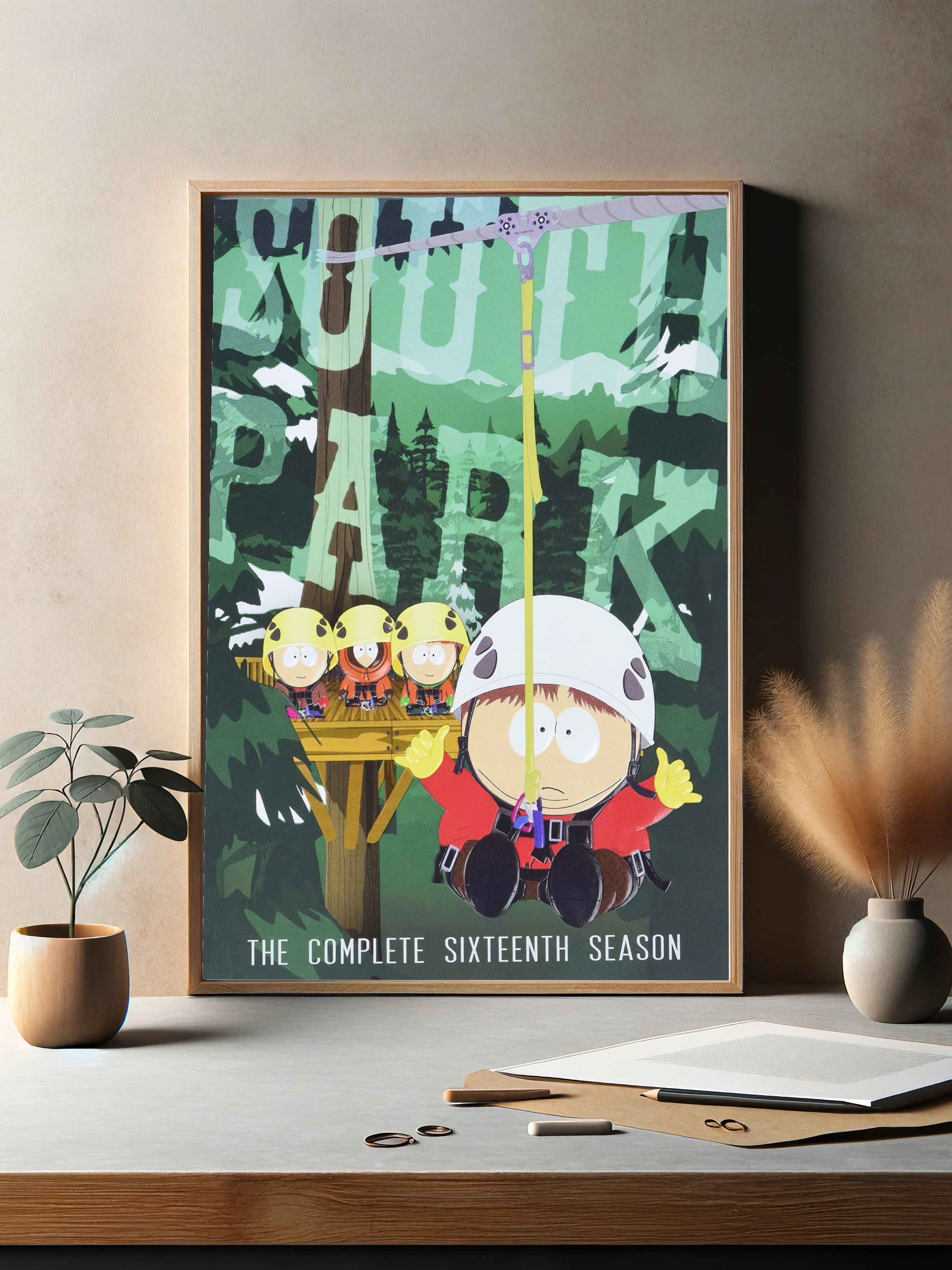 На этом авторском постере изображены главные герои популярного мультсериала «Южный Парк» в яркой и весёлой сцене приключения на природе. Малыши в жёлтых касках готовы к верёвочному спуску на фоне зелёного леса и деревянной площадки. Картина для спальни и интерьера детской комнаты, создаёт настроение веселья и дружбы.