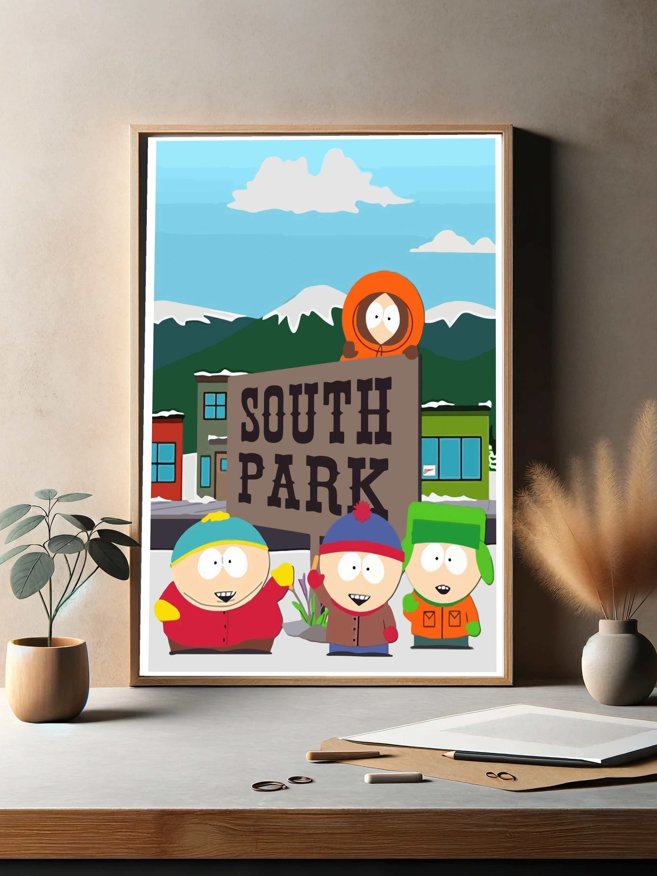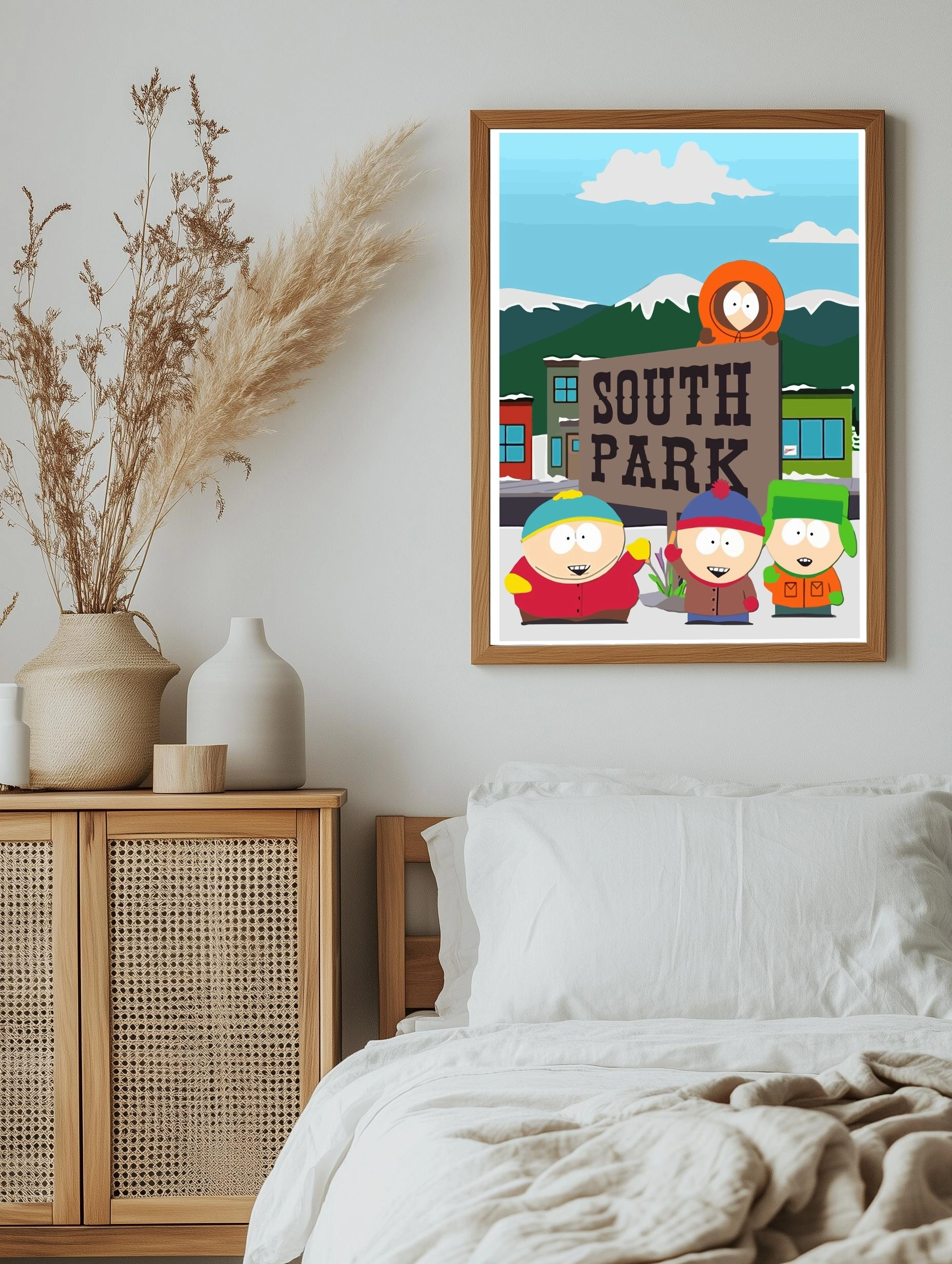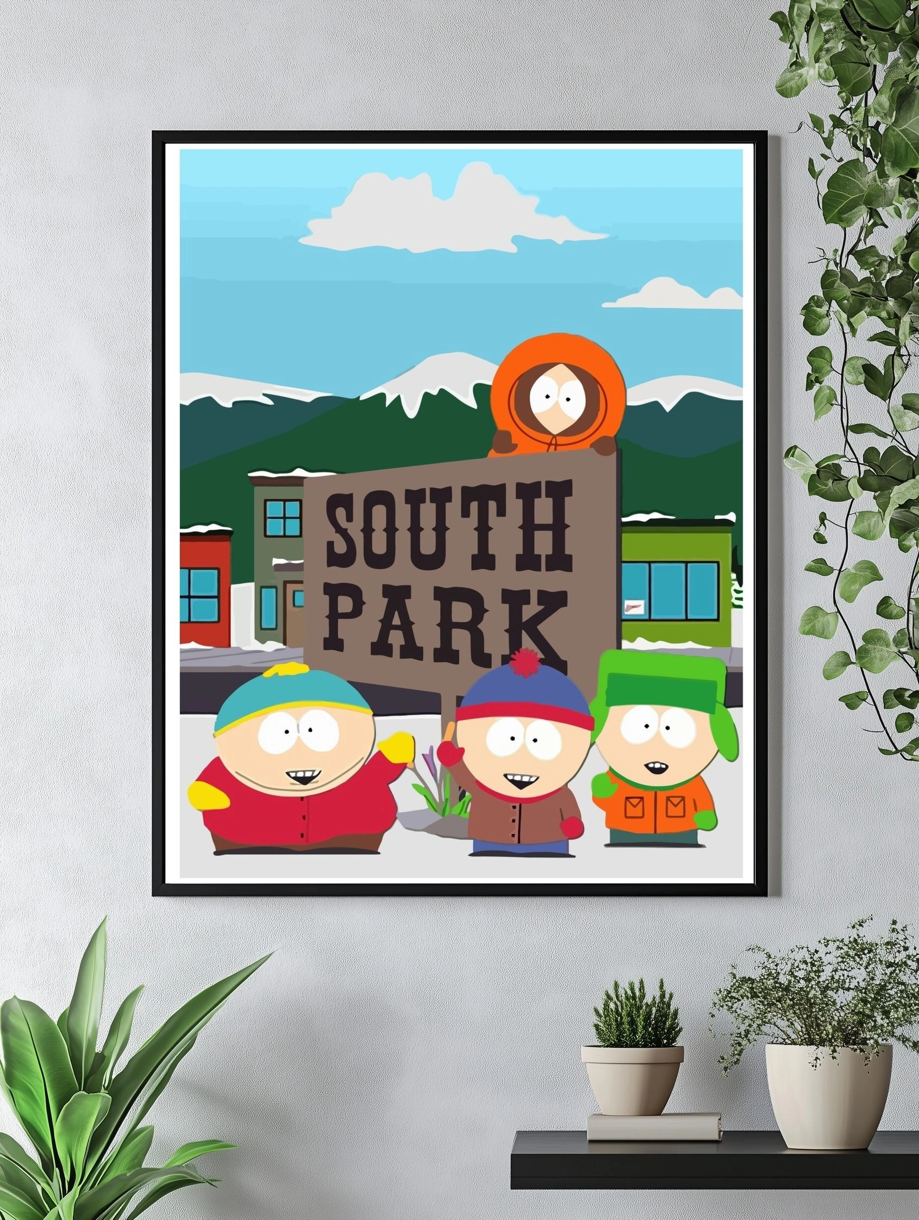 Яркое изображение с героями мультфильма Южный Парк: Картман, Стэн, Кайл и Кенни. На фоне гор и домов синие небеса и белые облака, все выполнено в традиционном мультяшном стиле с яркими цветами. Отличный декоративный плакат для поклонников мультфильма, который станет стильным декором стен и украстит гостиную или спальню.