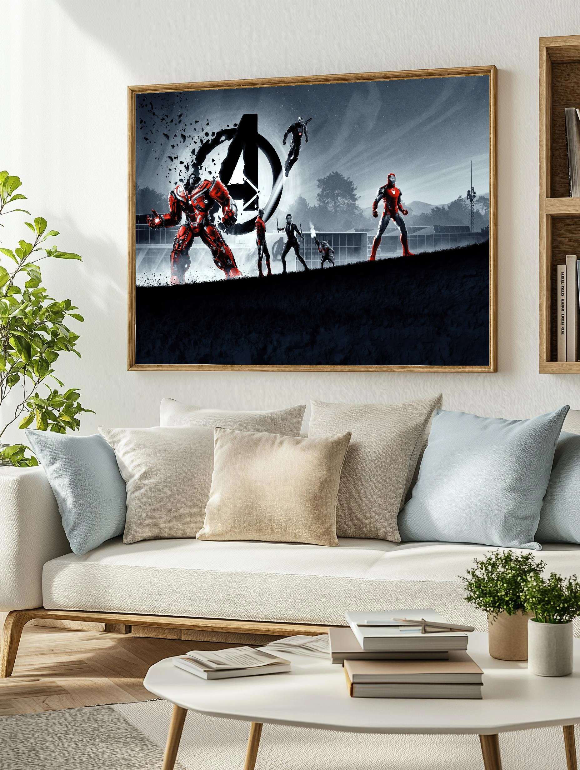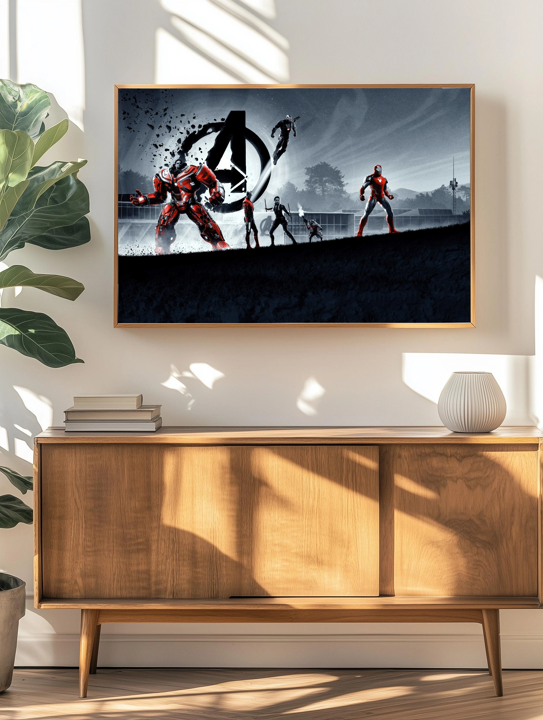 На изображении представлены известные персонажи из фильма ‘Мстители’ — Железный человек, Халк в броне, а также другие герои на фоне символа Avengers. Используется контраст серых и красных оттенков, создающих динамичное и насыщенное настроение. Это интерьерное искусство для поклонников супергероев, идеальный декоративный плакат с принтом для гостиной или офиса.