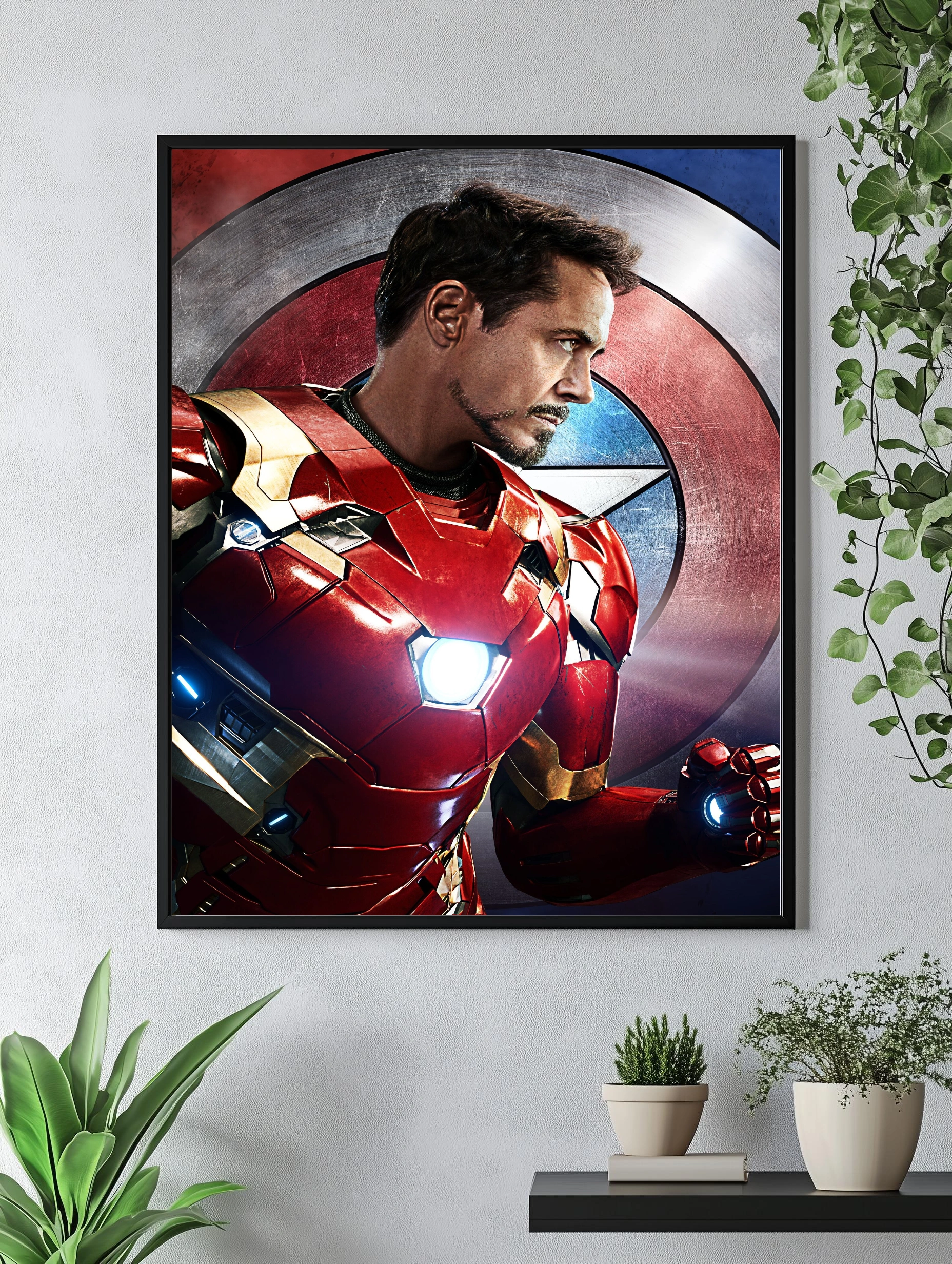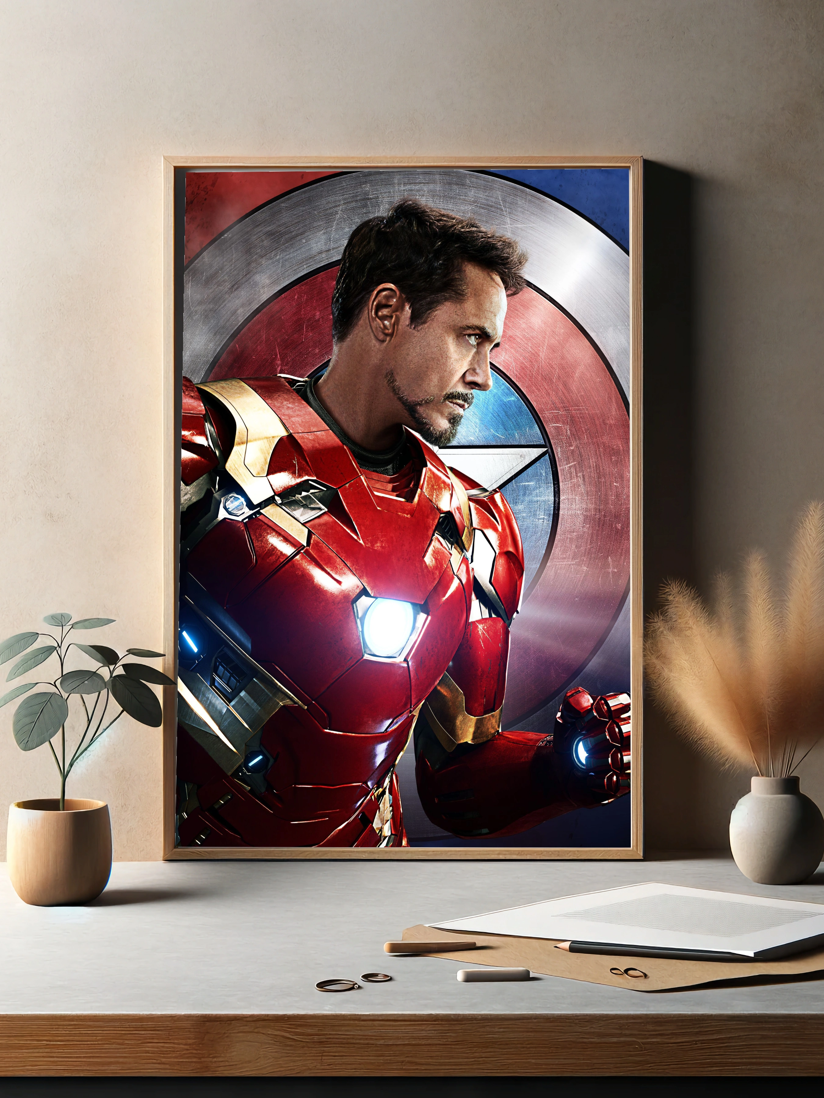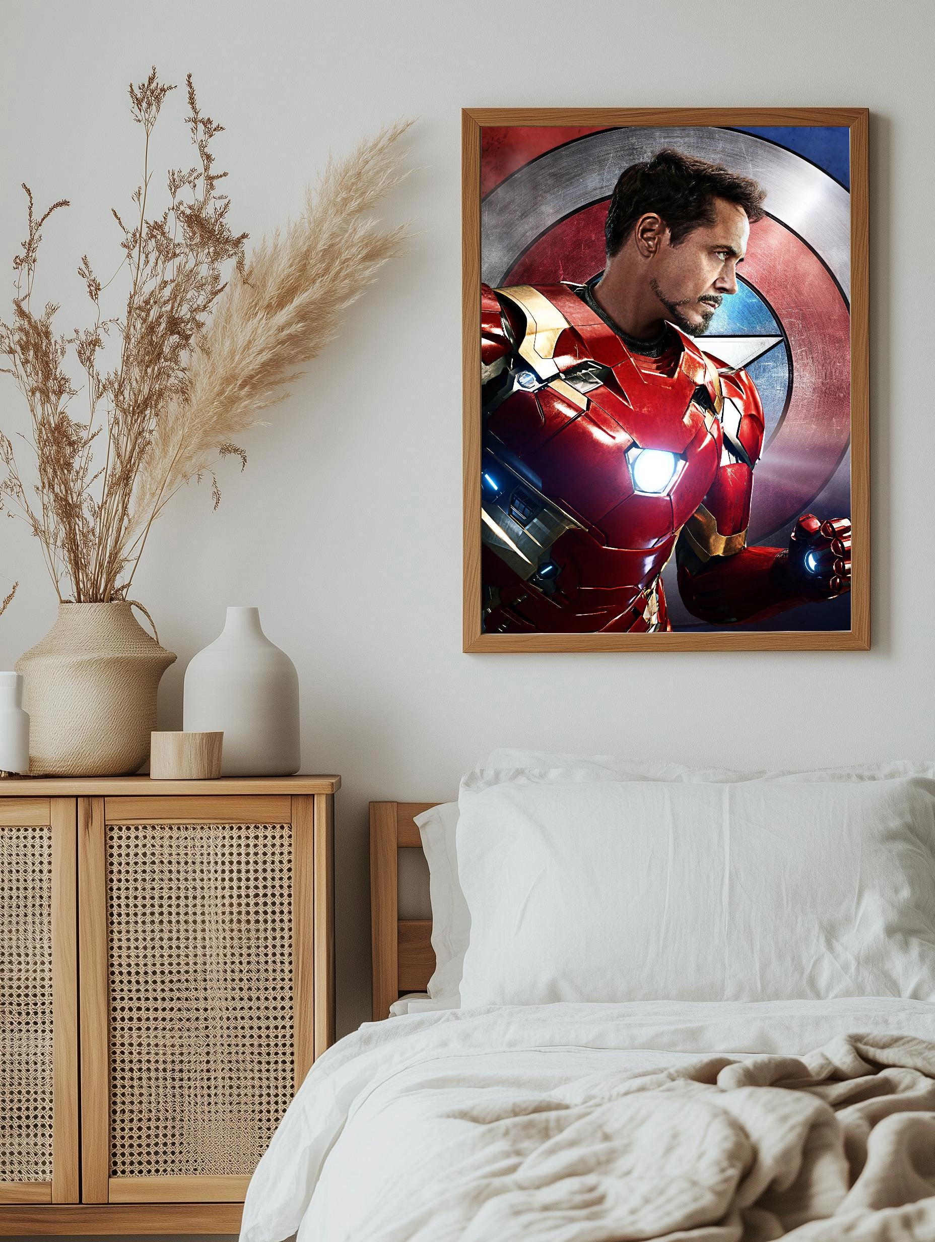 Декоративный плакат с изображением Железного человека (Тони Старк) в высокотехнологичной красно-золотой броне на фоне знаменитого щита Капитана Америки. Яркие и насыщенные цвета подчеркивают силу и решимость героя, создавая стильный декор стен для интерьера. Отличный художественный плакат для любителей супергероев и современного искусства для стен.