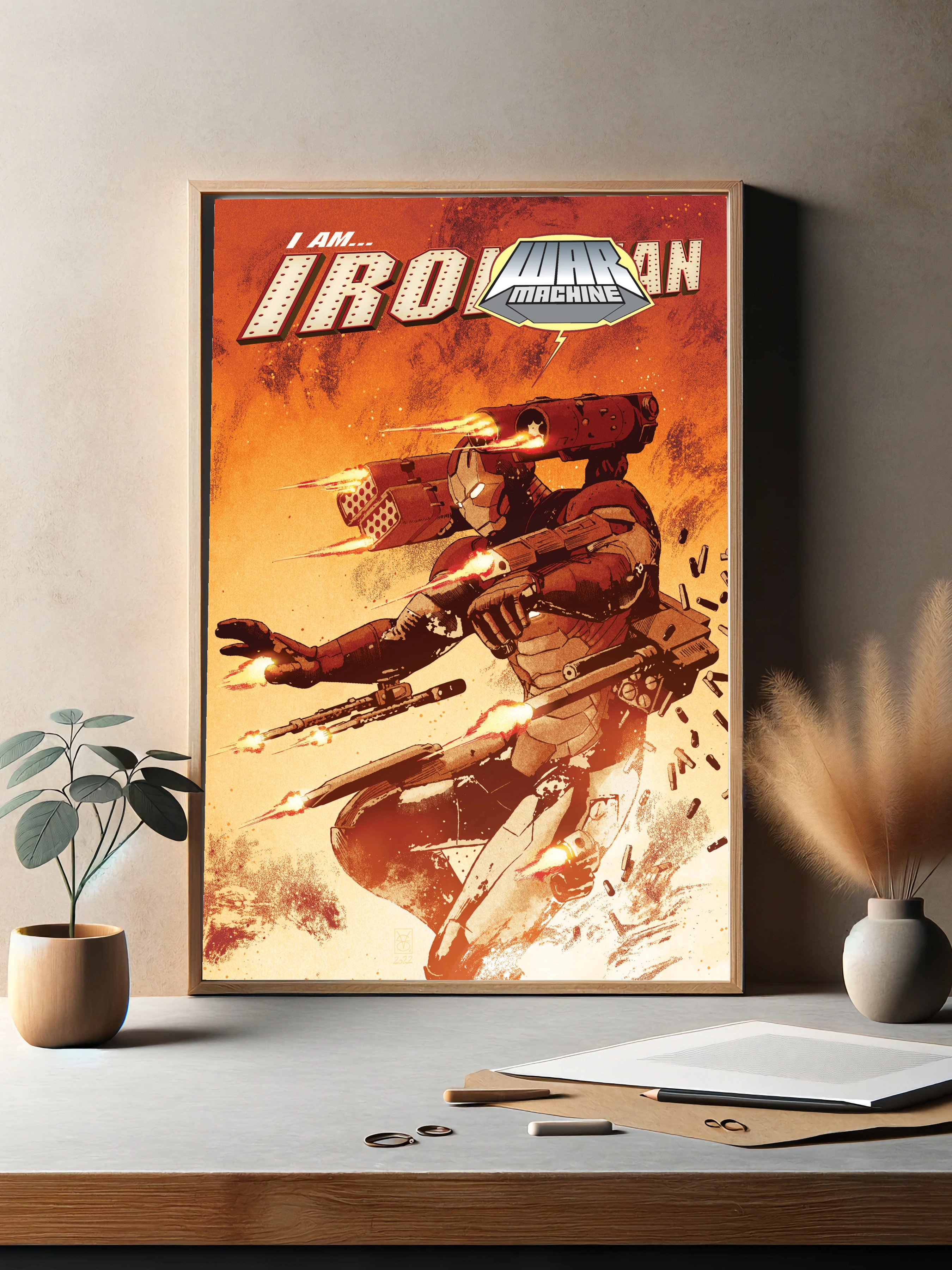Изображение представляет собой яркий интерьерный постер с персонажами Железный человек и Военная машина из комиксов и фильмов Marvel. В стиле современной графики используются сильные динамичные позы героев, огненные эффекты и насыщенные оранжевые и красные тона. Отличный выбор для декора комнаты или офиса поклонника Marvel.