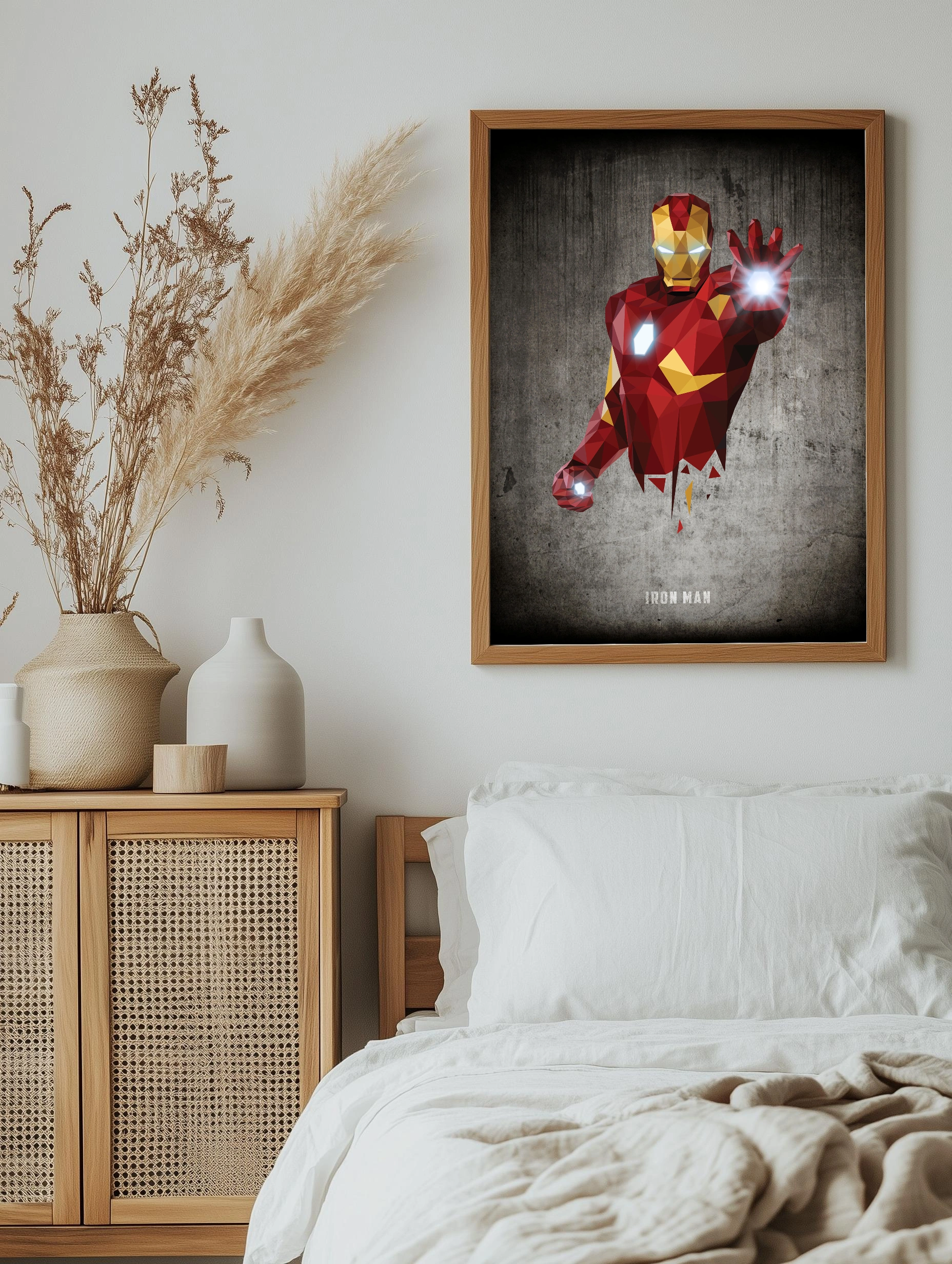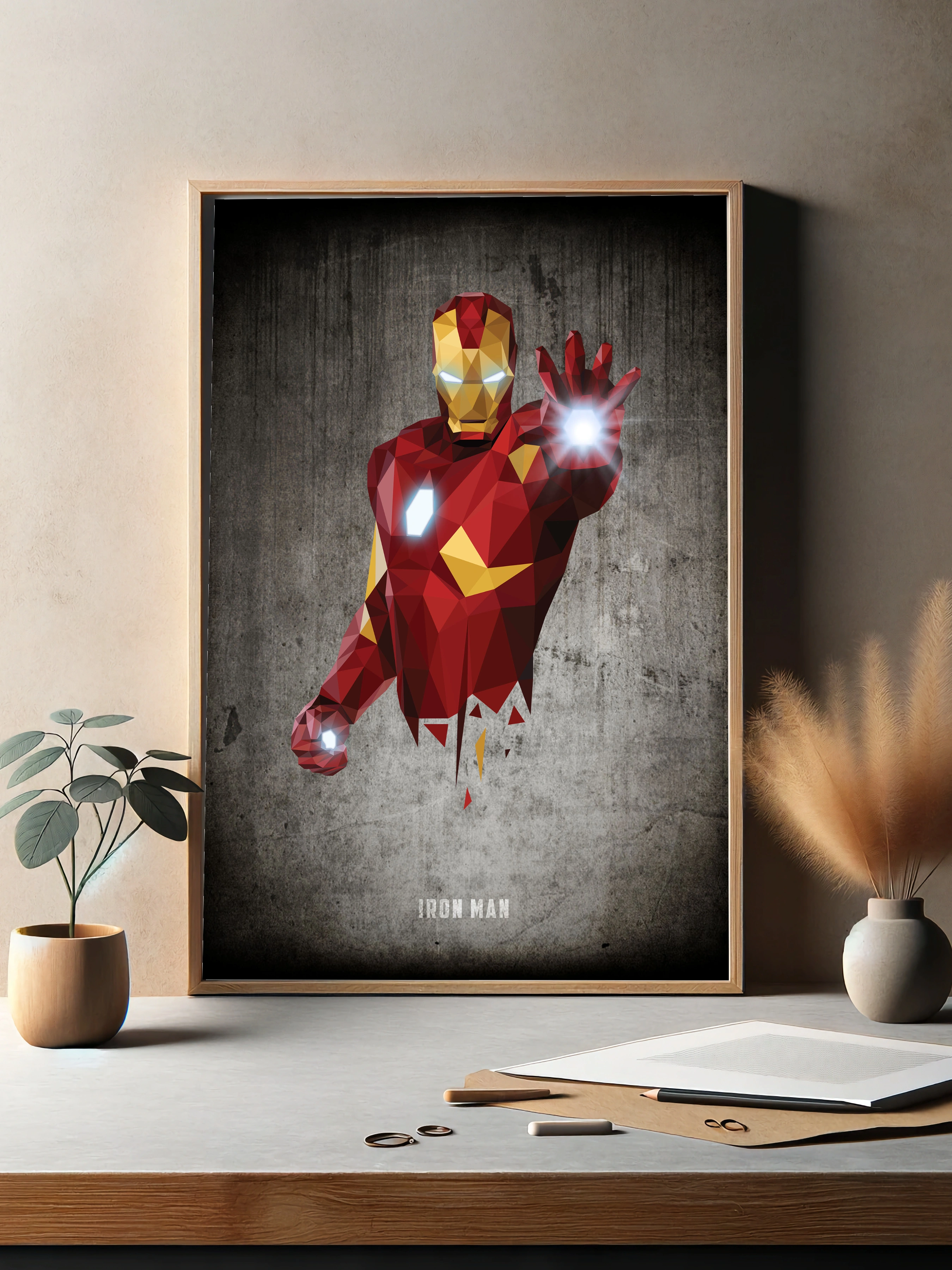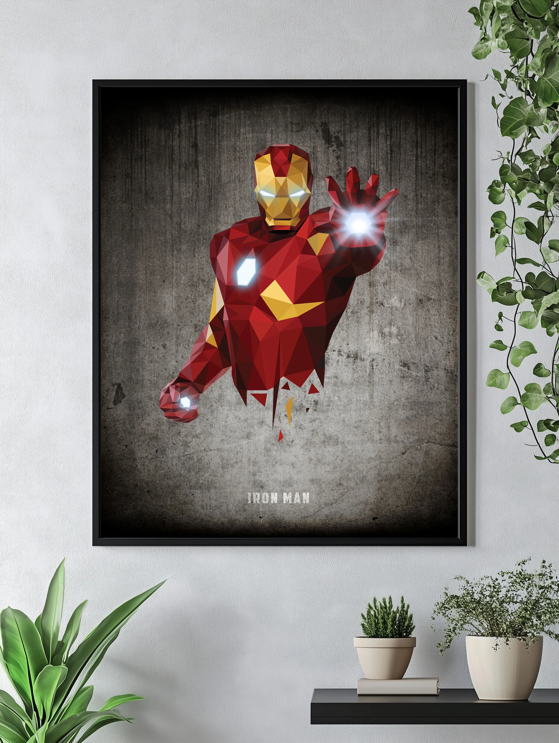 Изображение представляет знаменитого персонажа Marvel — Железного Человека, выполненного в стиле low poly с геометрическими фигурами. Фигура парит на фоне текстурированной бетонной стены, что добавляет индустриальности и современного шарма интерьерному искусству. Светящиеся элементы на глазах и ладонях подчеркивают технологичность и динамичность композиции. Этот художественный плакат отлично подойдет в качестве декоративного впечатляющего принта для гостиной или офиса, добавляя стильный декор стен.