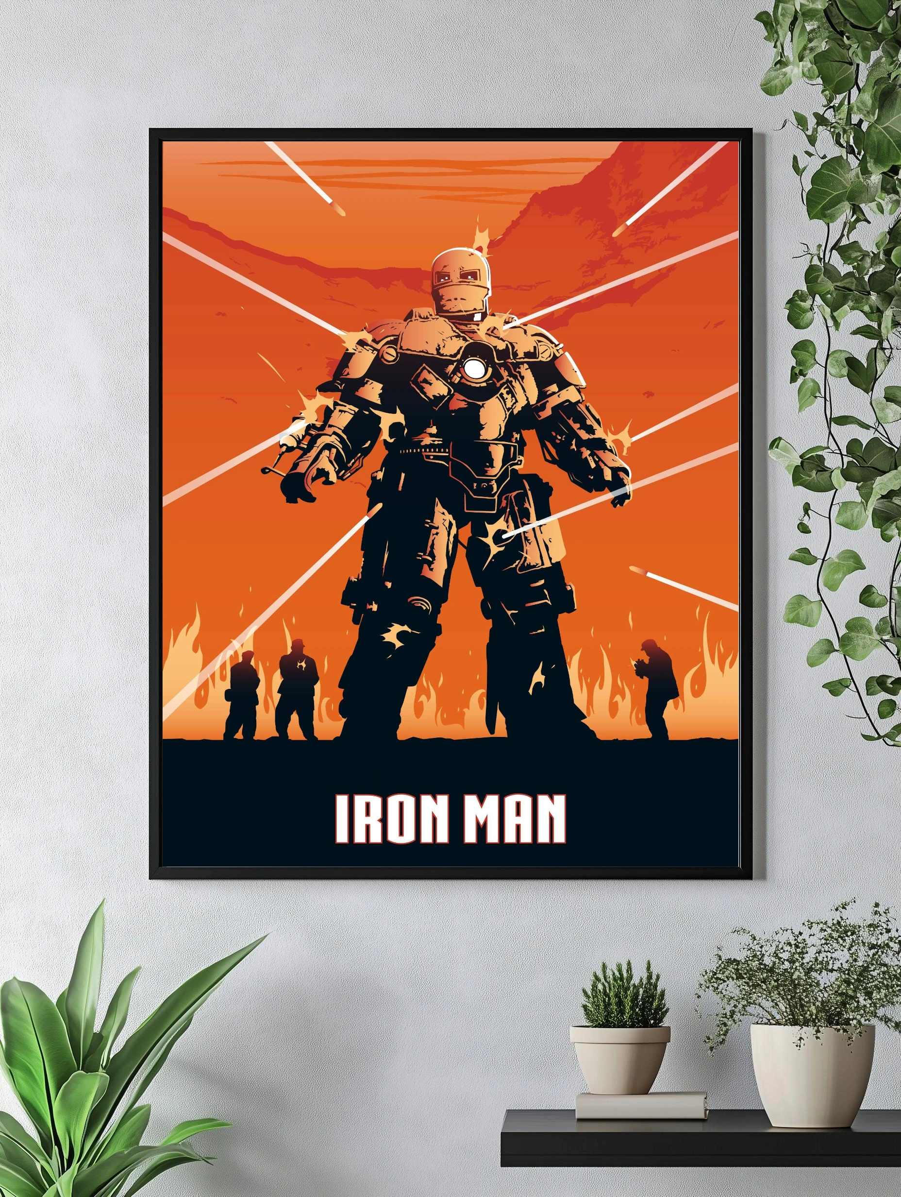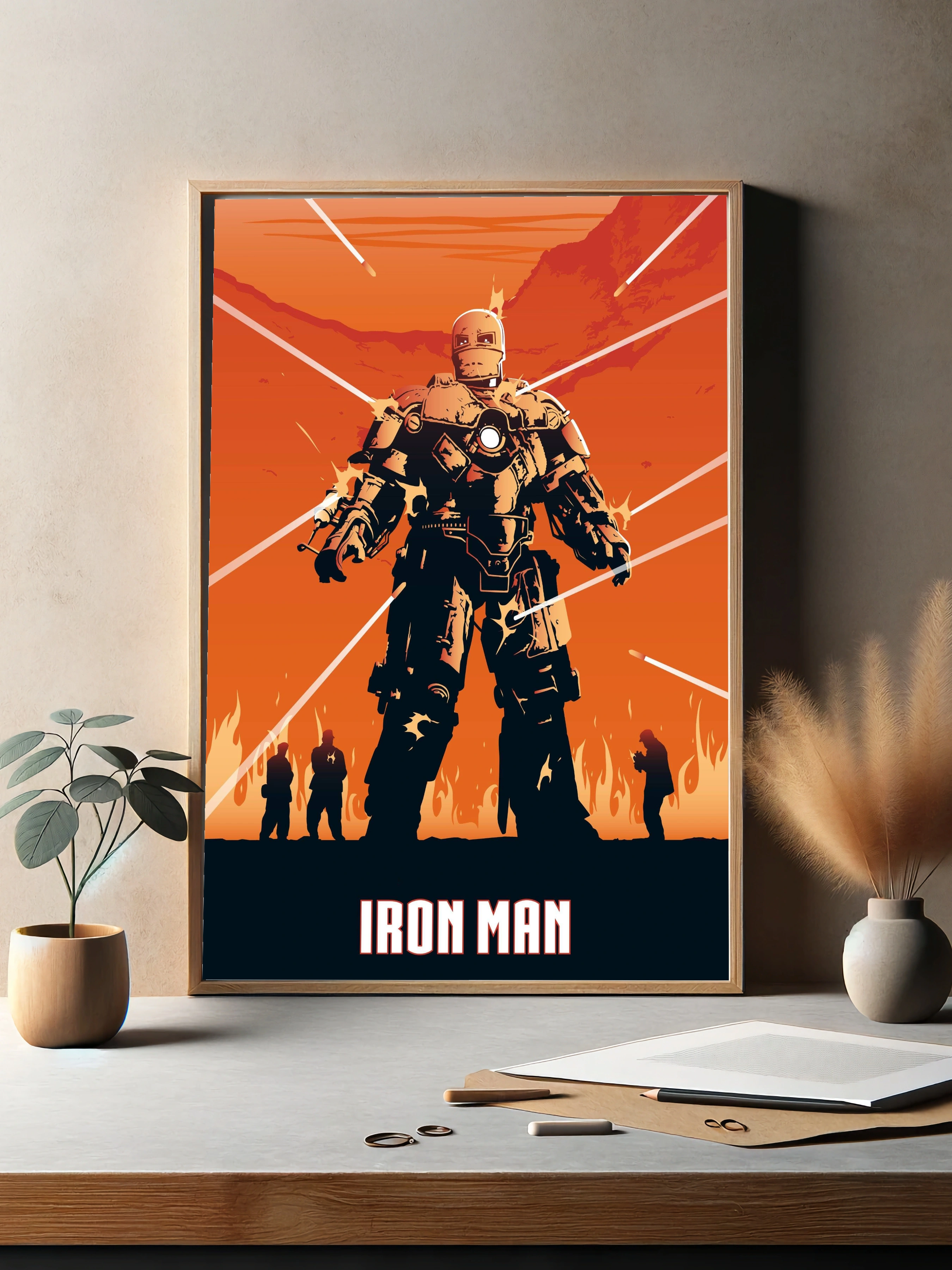 Изображение знаменитого супергероя Железного человека на фоне огня и ярко-оранжевого неба. Стиль выполнен в динамичной графической манере с акцентом на контрастном черном и оранжевом цветах, создавая мощное настроение и ощущение силы. Отличный декоративный плакат для современного интерьера и фанатов комиксов.