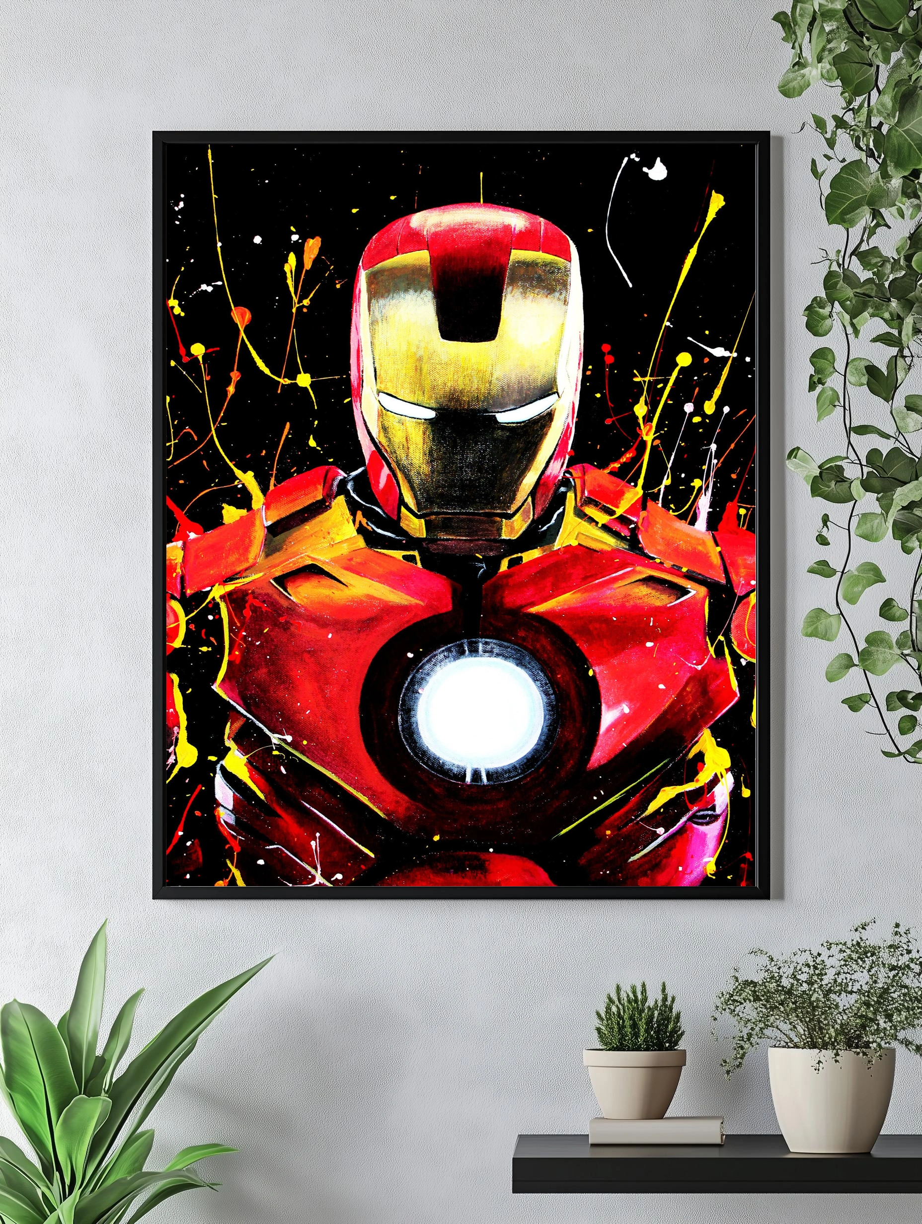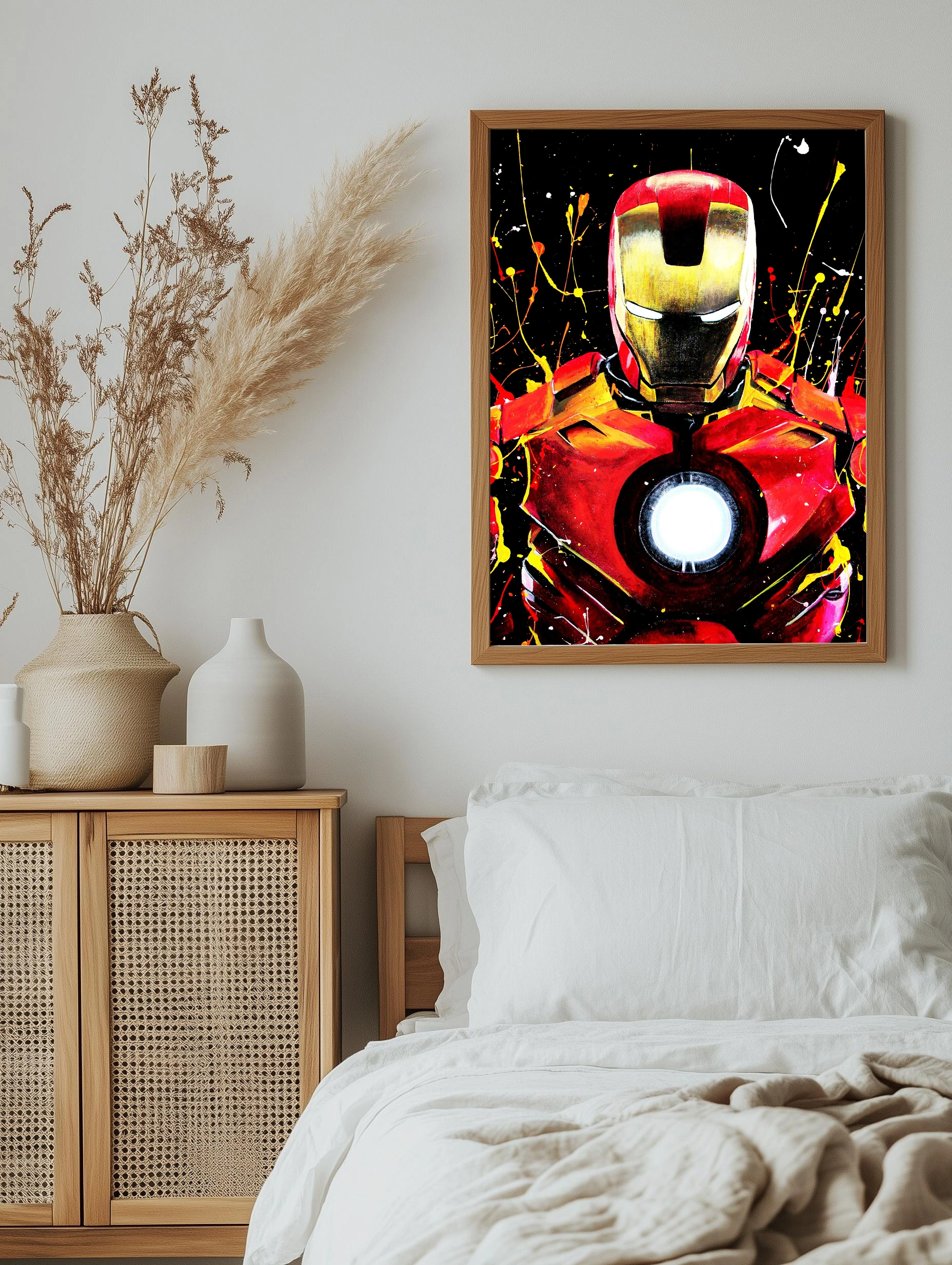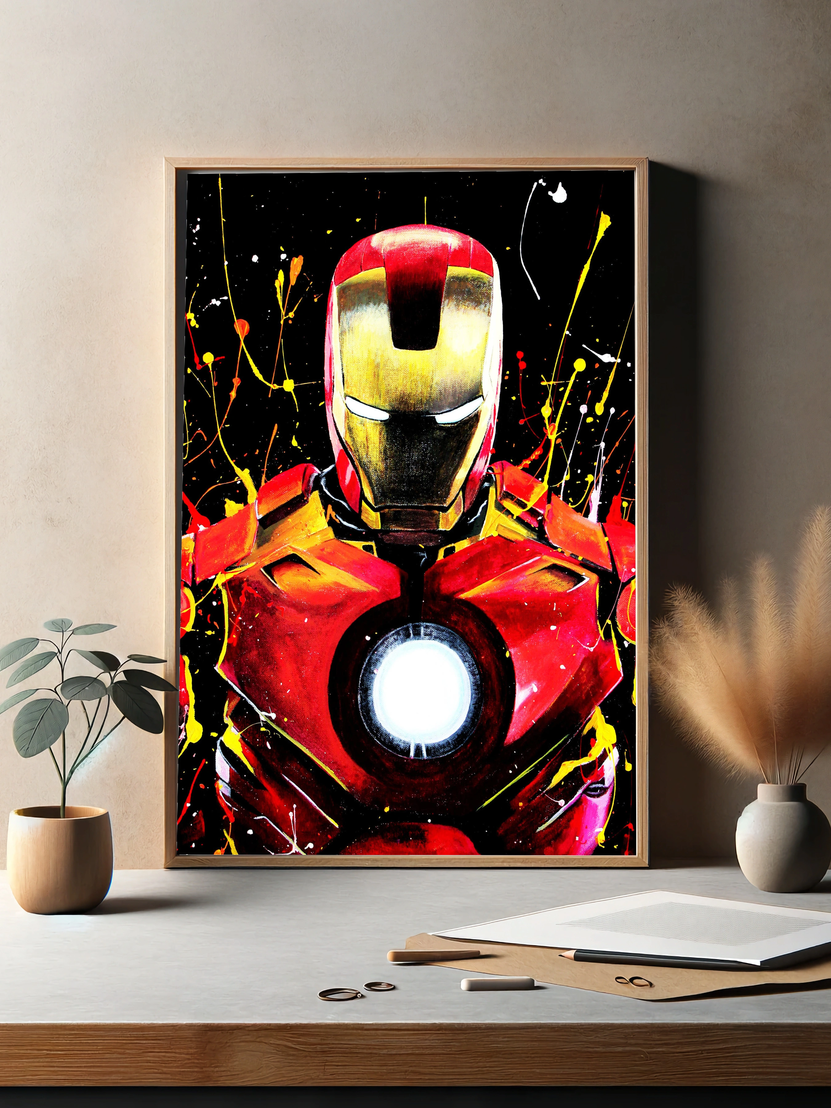 Впечатляющая картина с изображением Железного Человека на черном фоне с красными и желтыми брызгами краски. Стиль современного искусства с акцентом на динамику и энергию. Этот интерьерный декор прекрасно дополнит комнату, придавая ей современный и яркий характер. Идеально подходит для гостиной, офиса и молодежных интерьеров.
