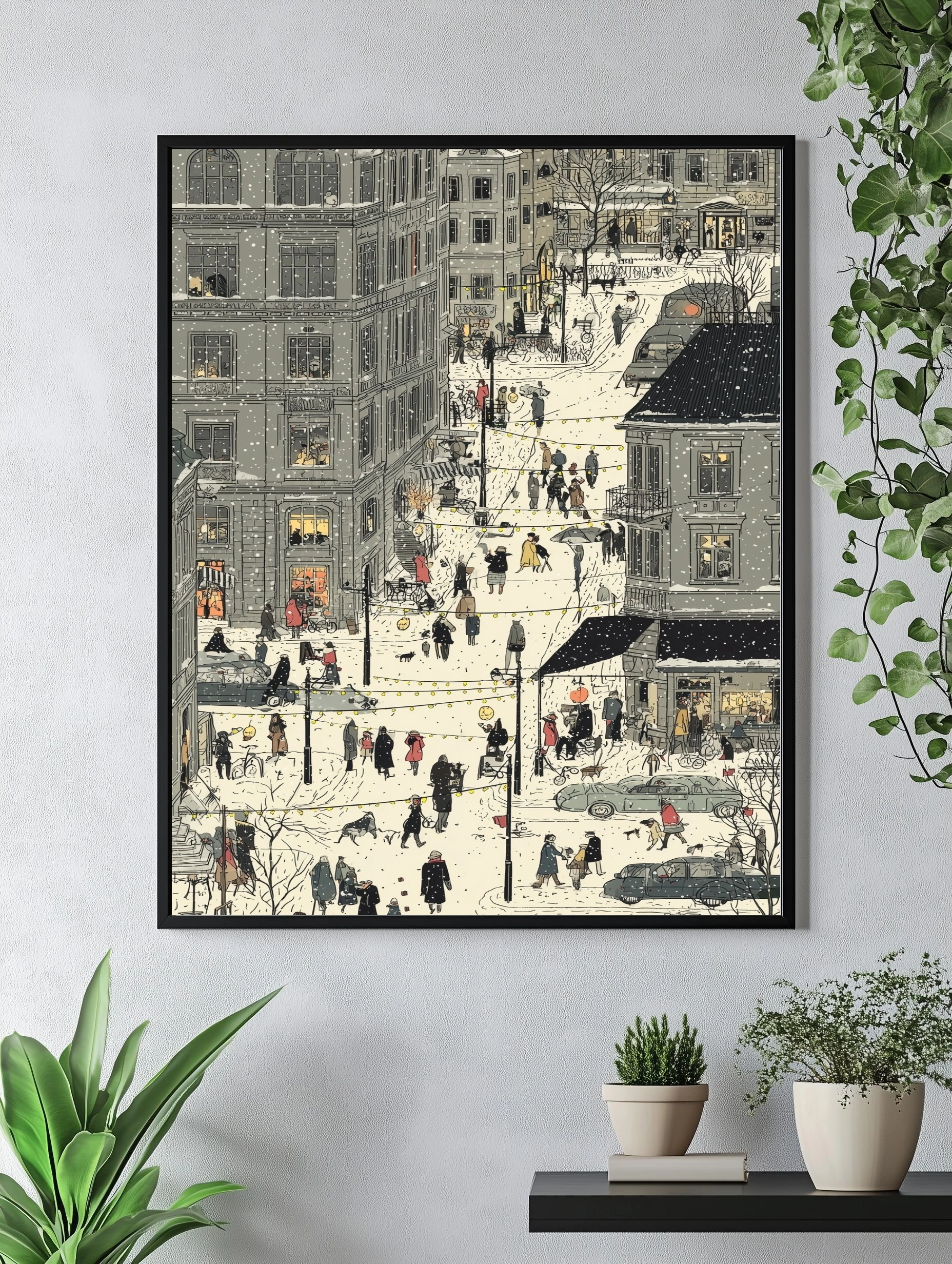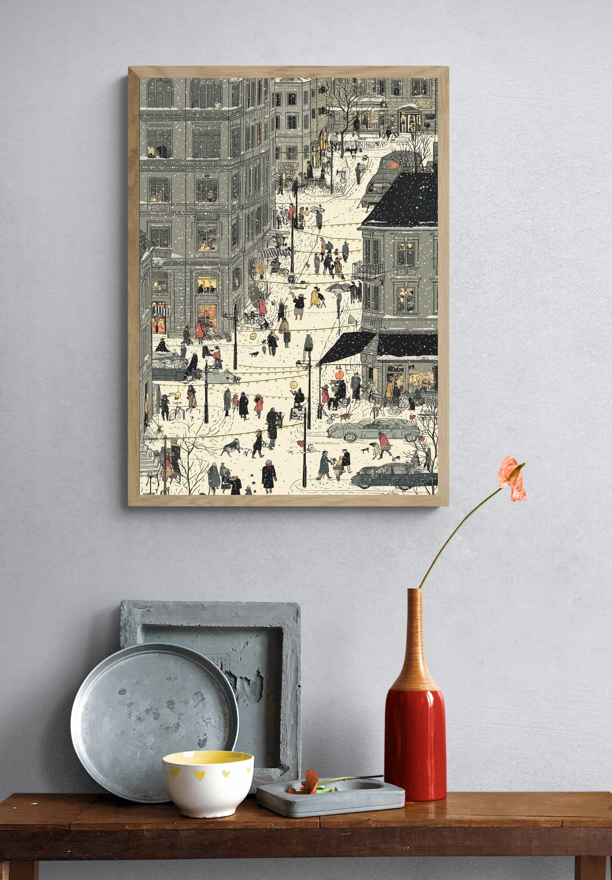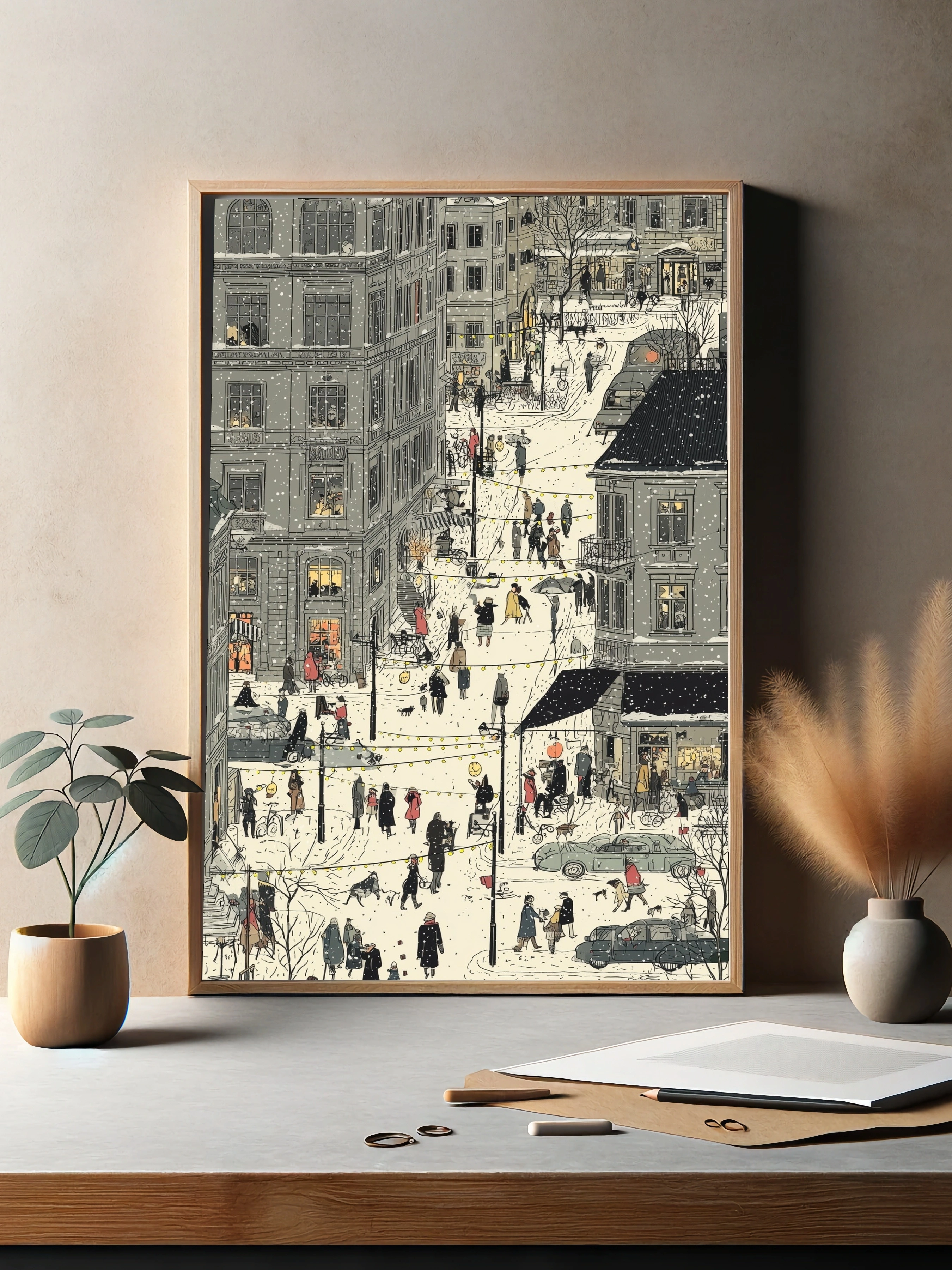 Погрузитесь в атмосферу зимнего вечера с этим удивительным постером, изображающим оживлённую городскую улицу, покрытую снежным покровом. На переднем плане множество людей, одетых в яркие зимние пальто, прогуливаются по улице, создавая живую картину повседневной жизни. В центре композиции выделяются уютные кафе с тёплыми огнями, манящими к себе прохожих. Уличные фонари, украшенные гирляндами, добавляют волшебства в эту зимнюю сцену. Цветовая гамма включает мягкие серые и белые оттенки, контрастирующие с яркими акцентами красного, жёлтого и зелёного. Стиль постера — современный иллюстративный, передающий атмосферу уюта и тепла. Идеально подойдёт для оформления гостиной, спальни или офиса, создавая атмосферу вдохновения и спокойствия. Этот постер станет отличным выбором для семей, креативщиков и всех, кто ценит зимнюю романтику.