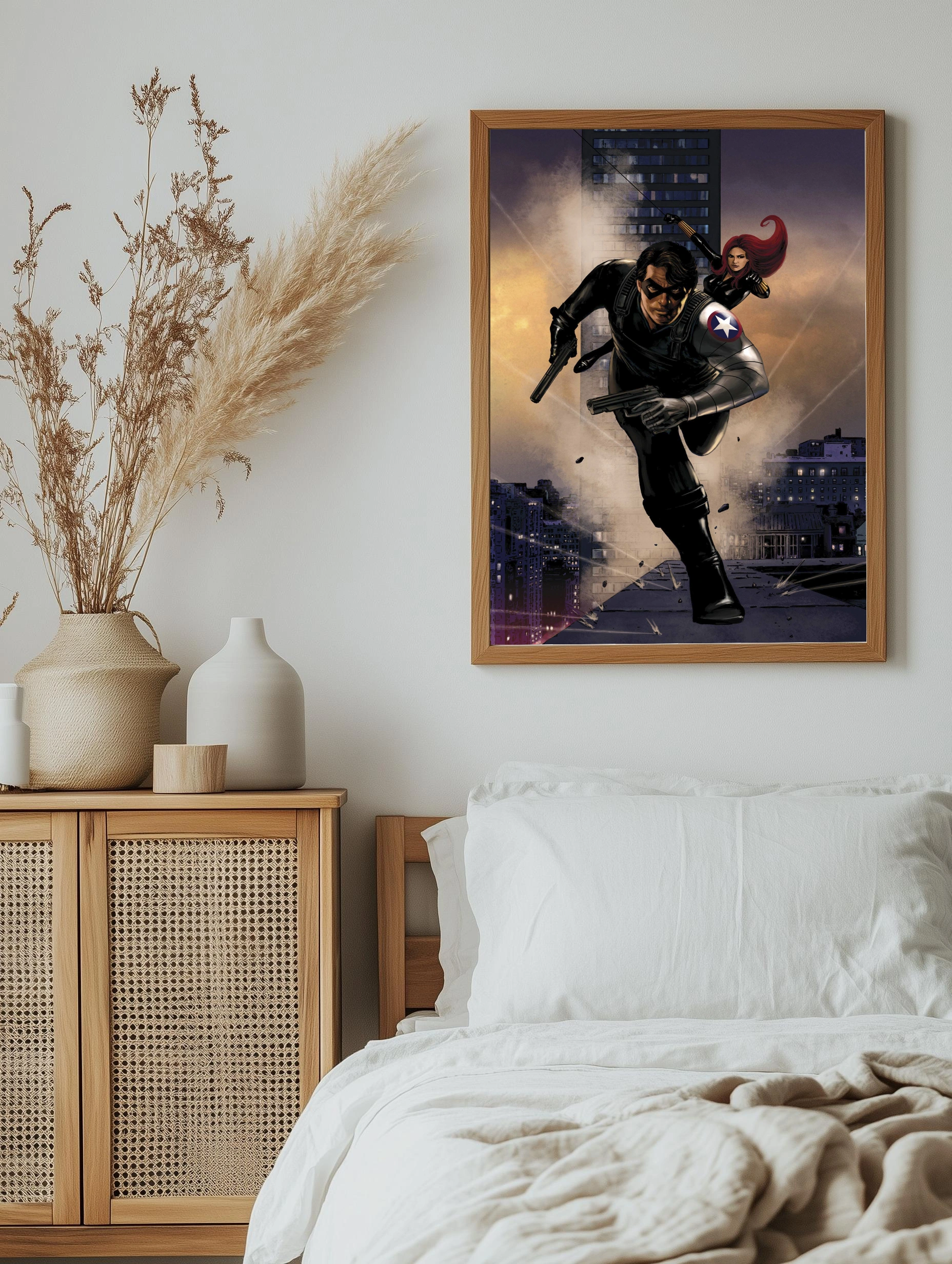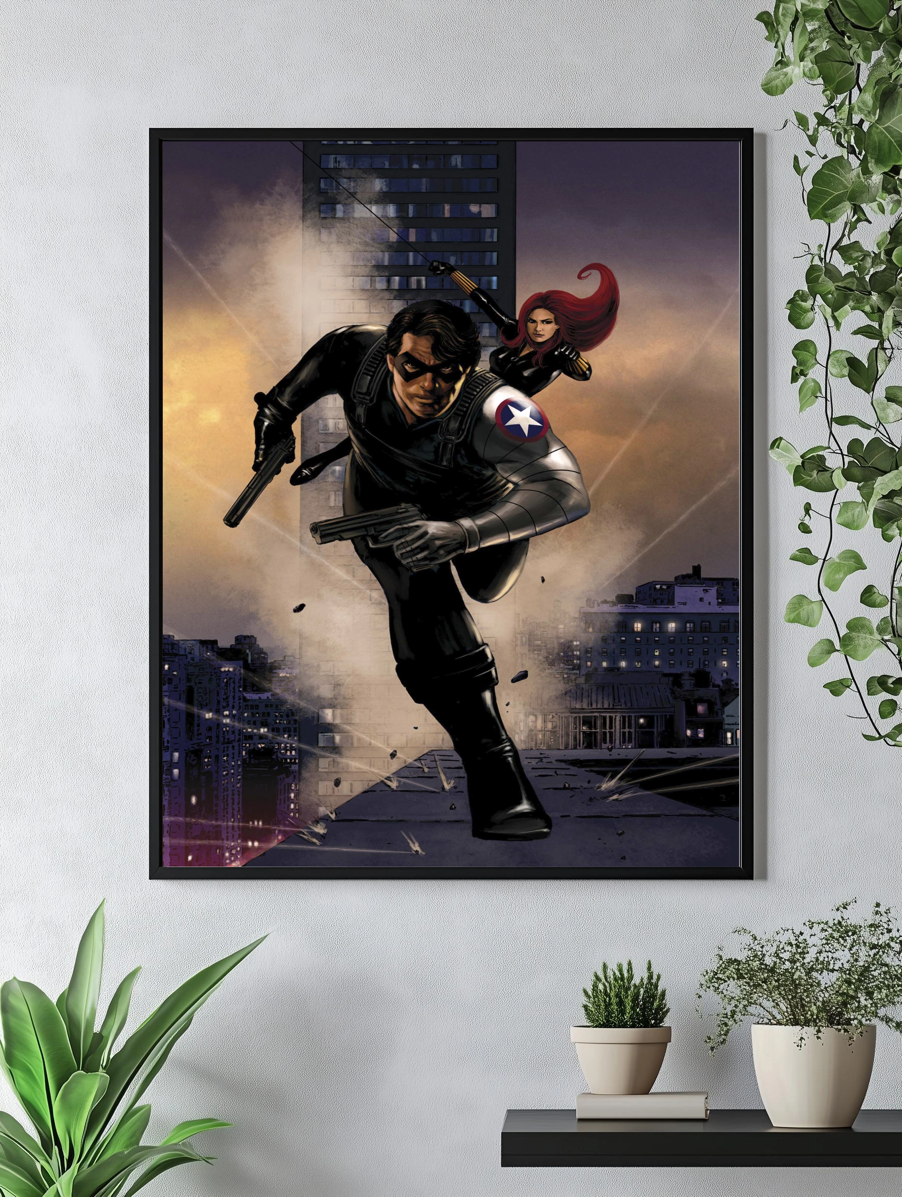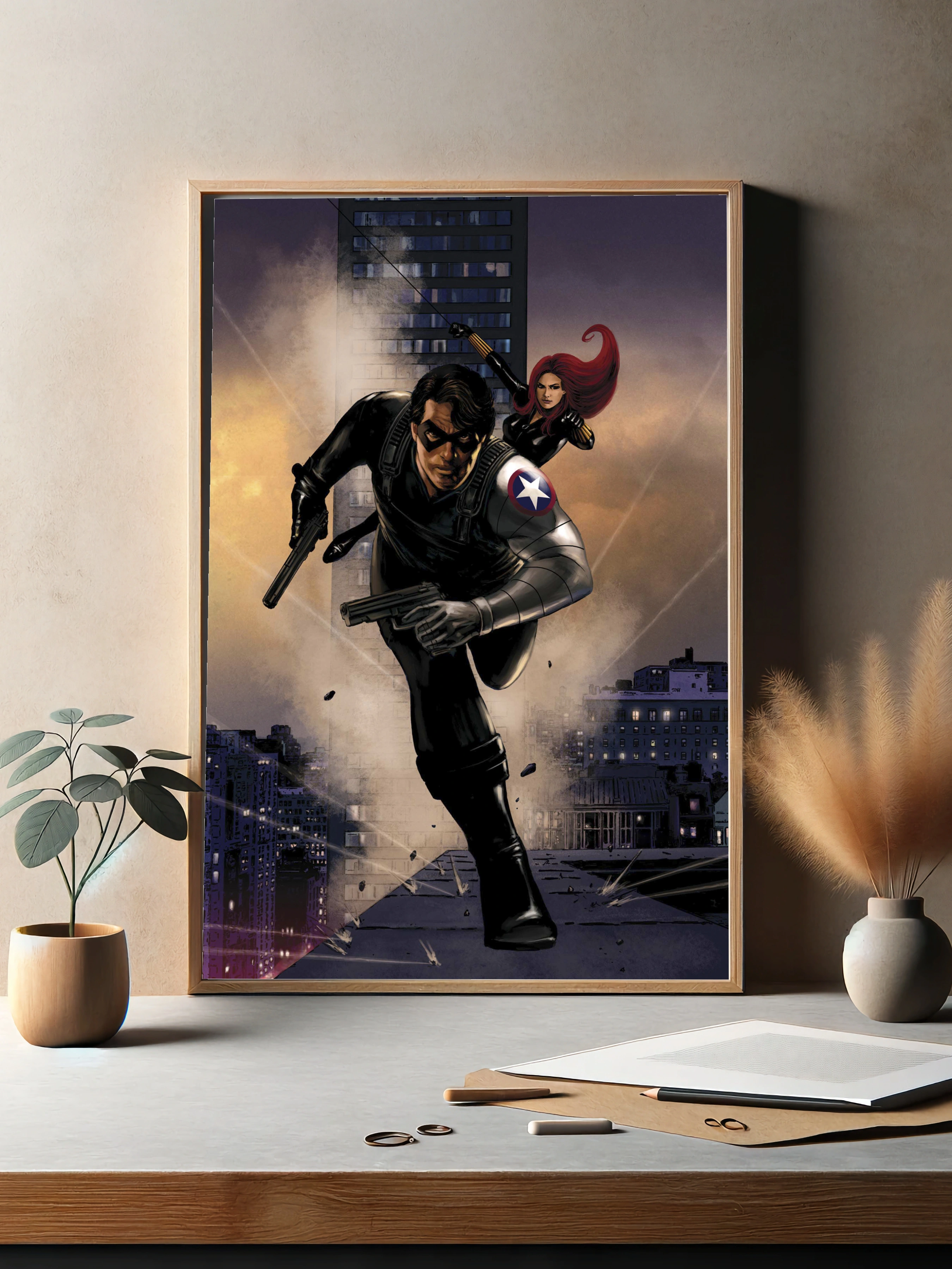 На этом декоративном плакате в стиле комиксов изображены персонажи Marvel — Зимний солдат и Чёрная Вдова. Они стремительно движутся вперед в ночном урбанистическом пейзаже, полный напряжения и экшена. Позади — темный город с высотками, в воздухе пыль и искры, создающие атмосферу динамики и опасности. Этот интерьерный художественный плакат отлично подойдет для современного интерьера, привнося ощущение приключения и стильный декор стен.