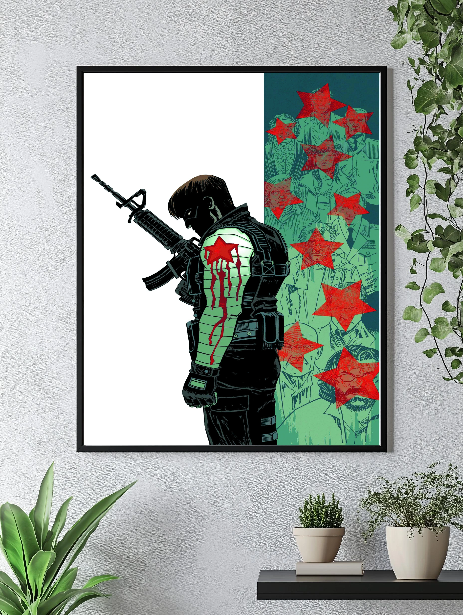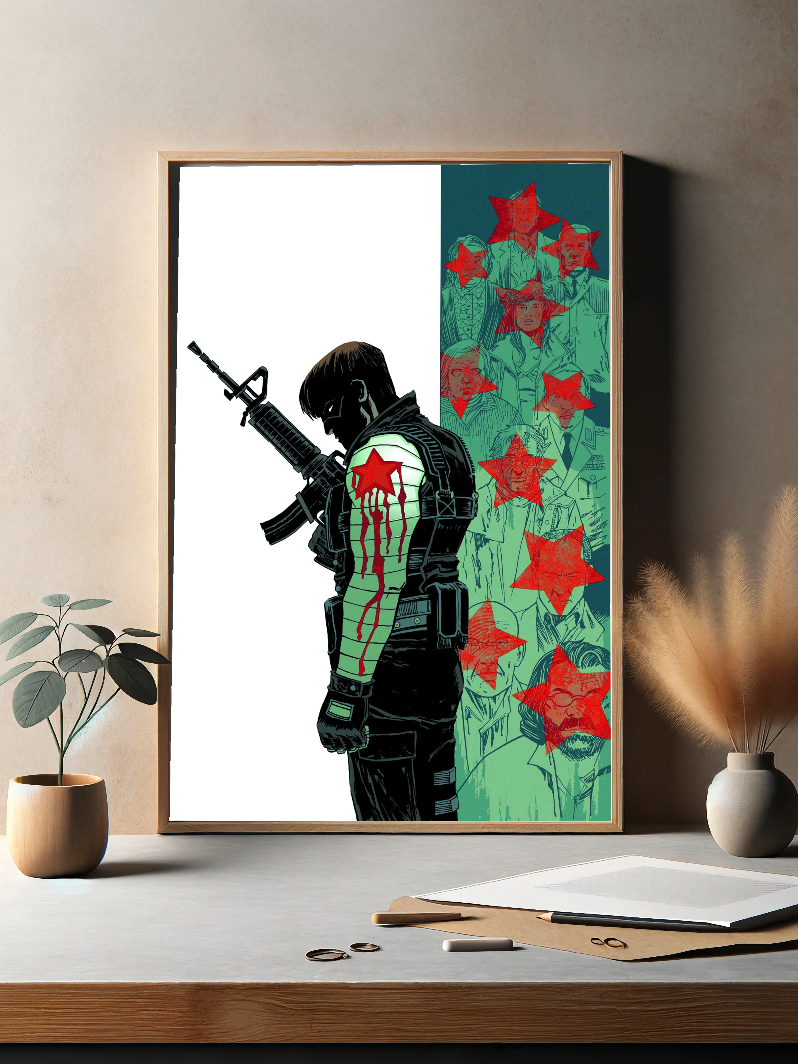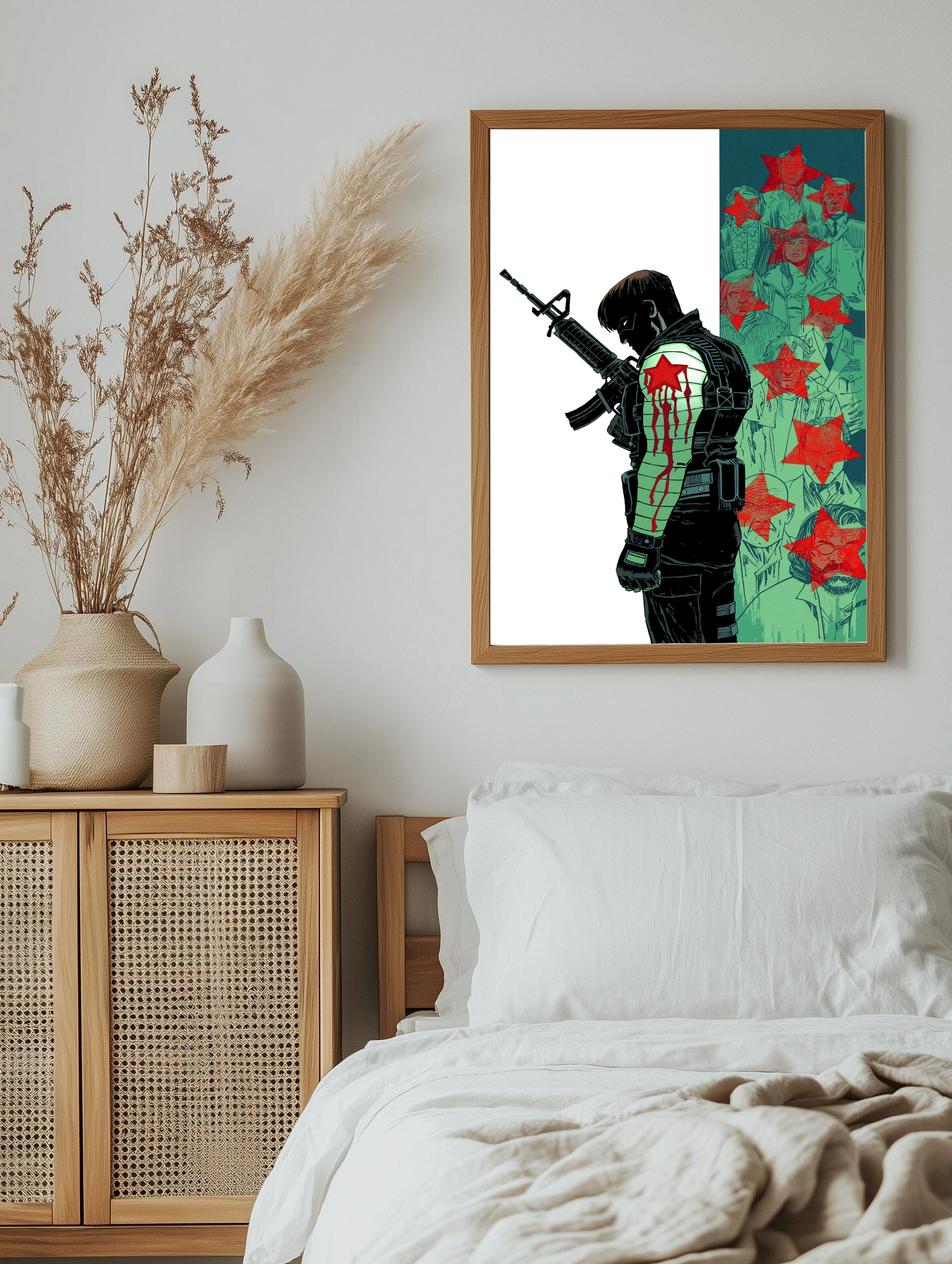 Данный художественный плакат изображает мрачного солдата с кровавой красной звездой на светлой руке, символизирующей боль и борьбу. На фоне стилизованные портреты людей, отмеченные теми же звездами, создающие атмосферу политического конфликта и внутреннего противостояния. Постер выполнен в современном графическом стиле с акцентом на контраст между светлыми и тёмными тонами, идеально подходит для интерьерного декора в стиле современного искусства для стен дома или офиса.