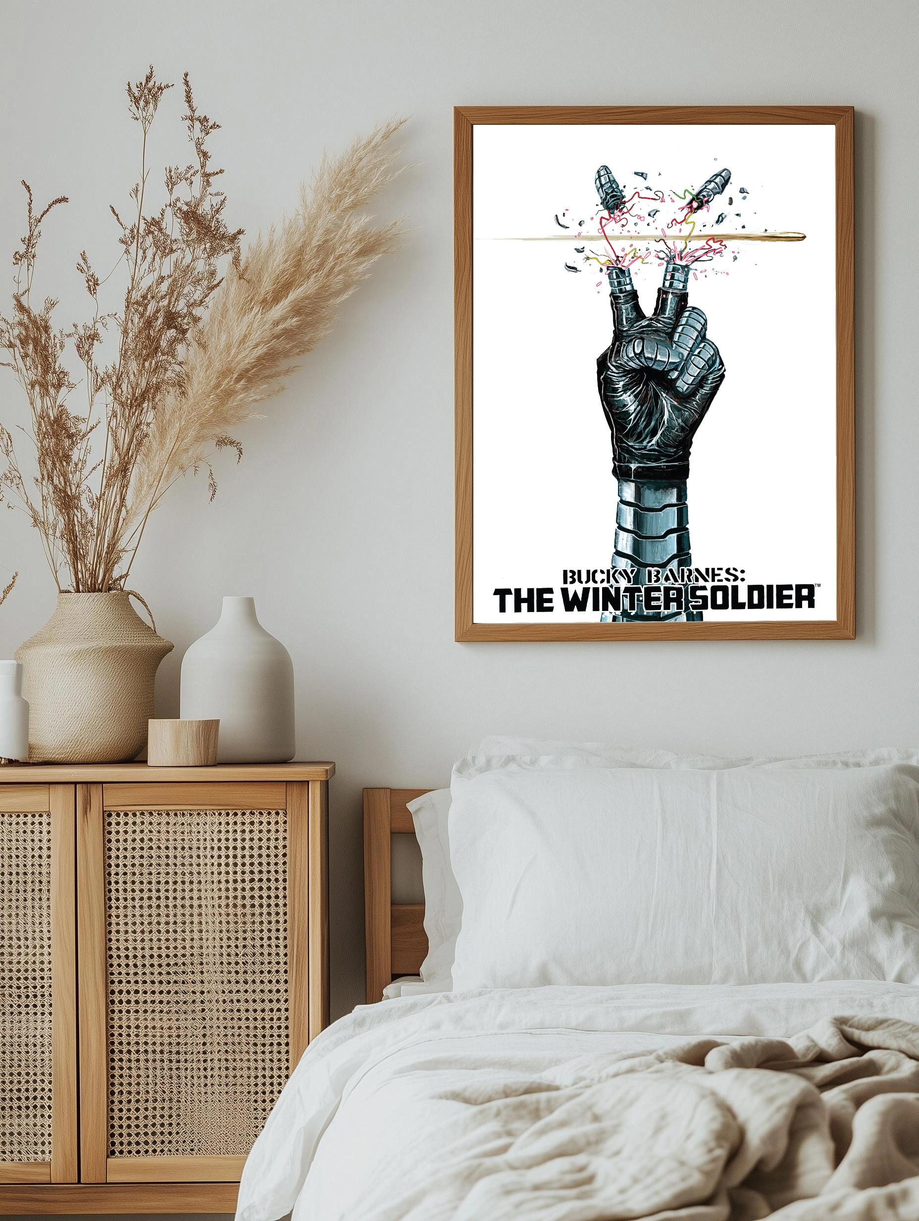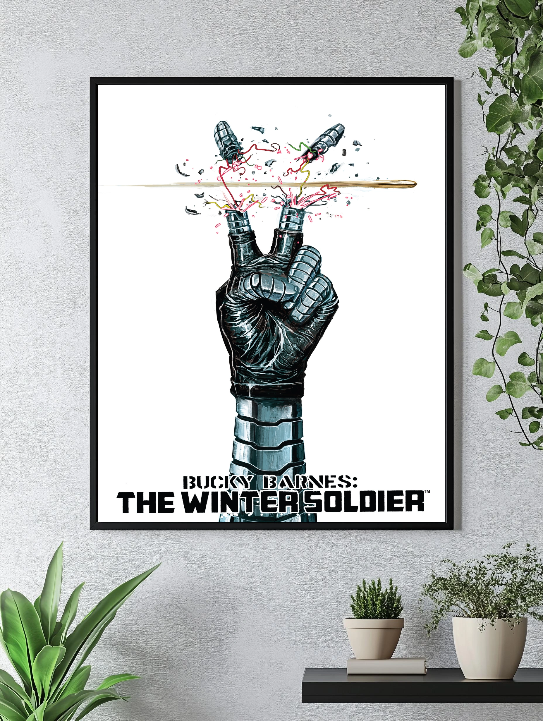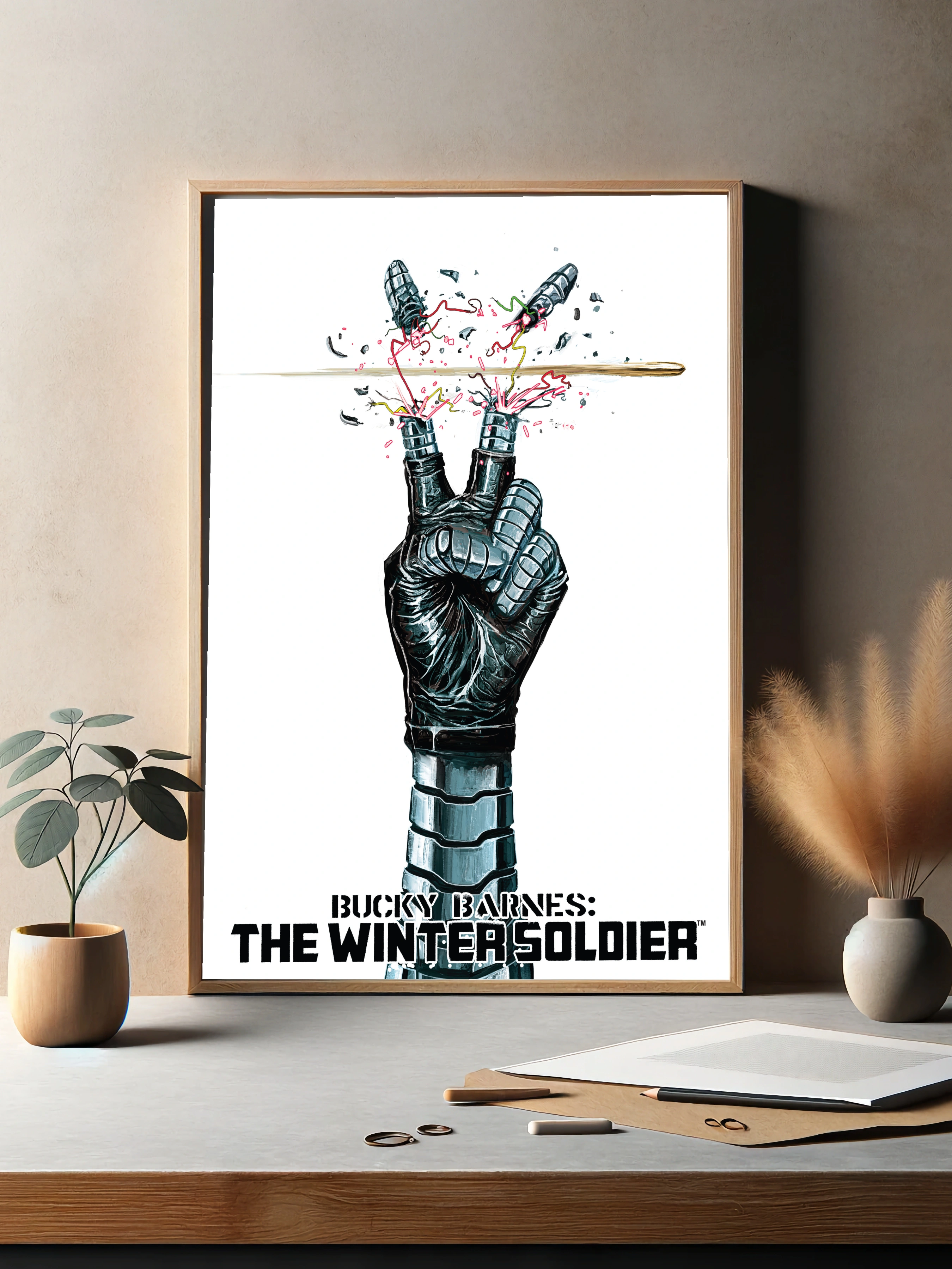 На художественном плакате изображена механическая рука Зимнего Солдата, сжимающая спичку, которая рвется на части с искрами и проводами. Картина выполнена в стиле современного искусства с акцентом на металлические оттенки и детализированные элементы. Этот интерьерный постер отлично подойдет для гостиной, офиса или спальни, добавляя стильный и мощный акцент в интерьер.