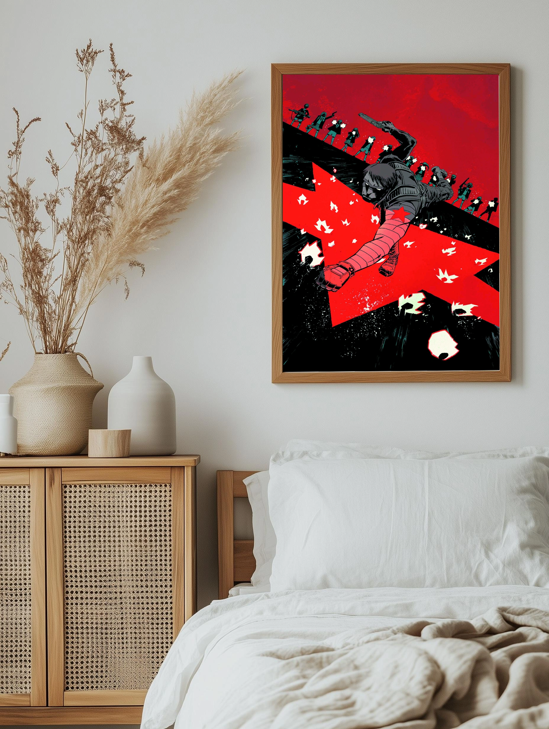 Декоративный плакат с изображением динамичной боевой сцены в комикс-стиле. Центральный персонаж в маске и с оружием на фоне красного символа звезды, символизирующего напряжение и силу. Отличный интерьерный постер для спальни или офиса, добавляющий драматизм и современное искусство для стен.