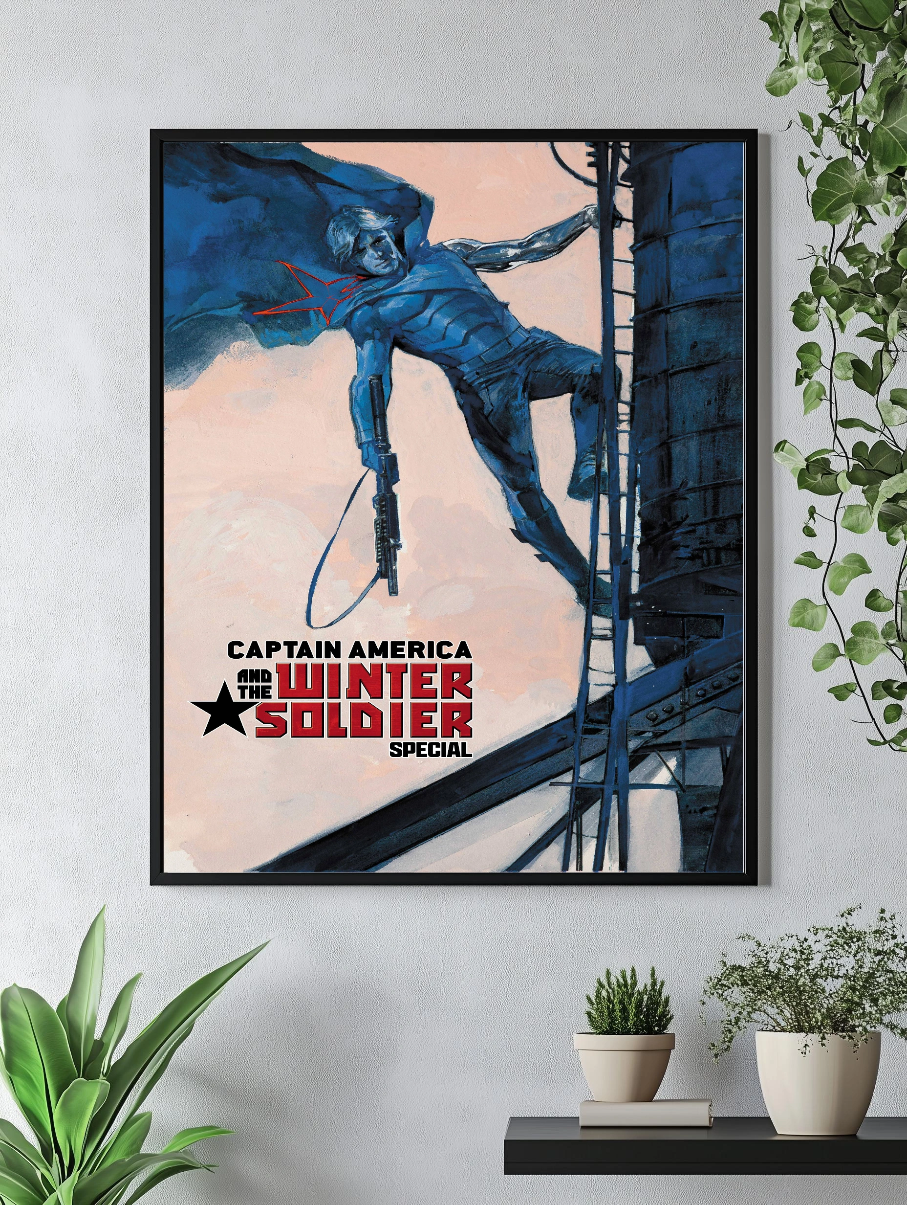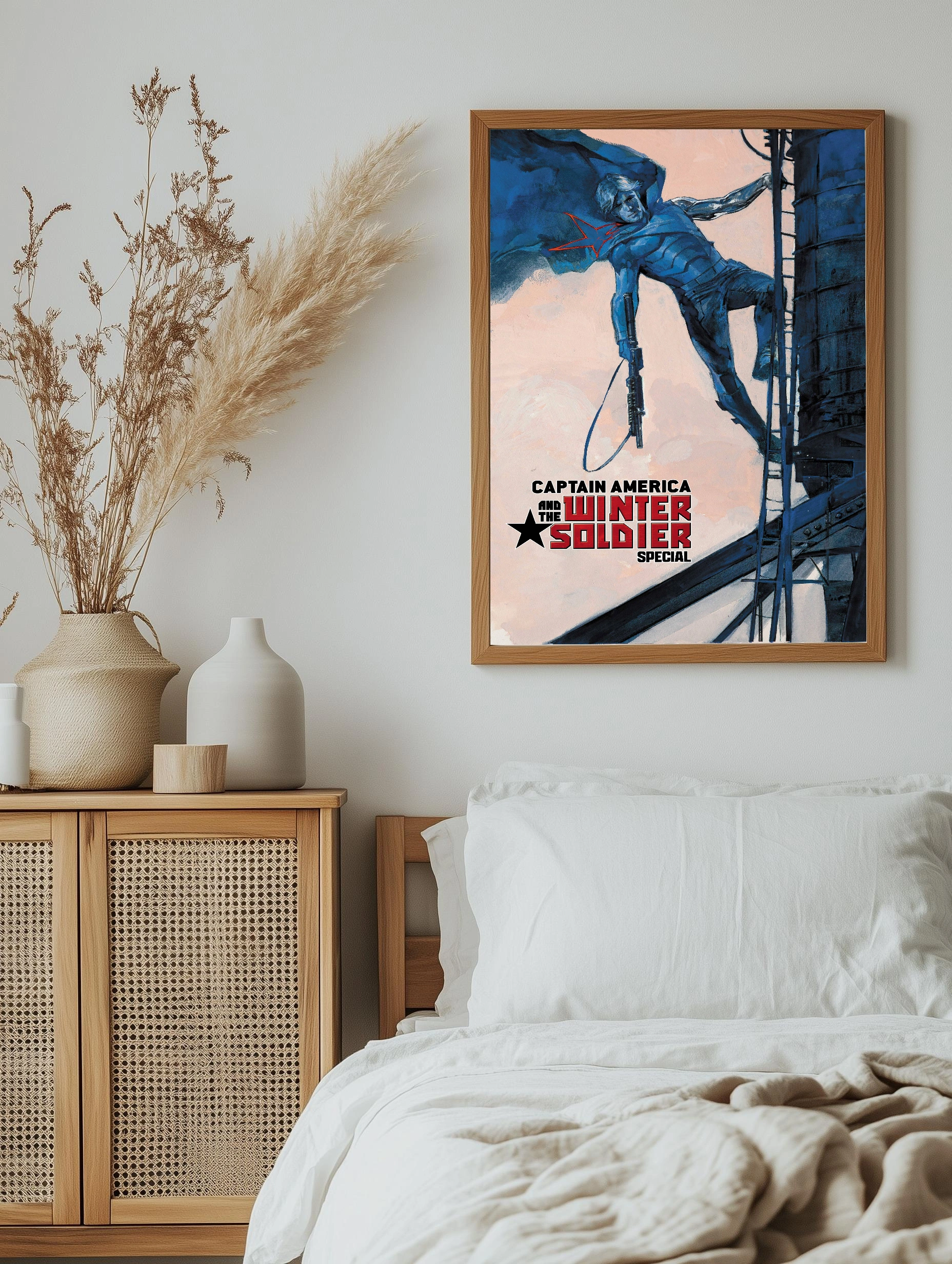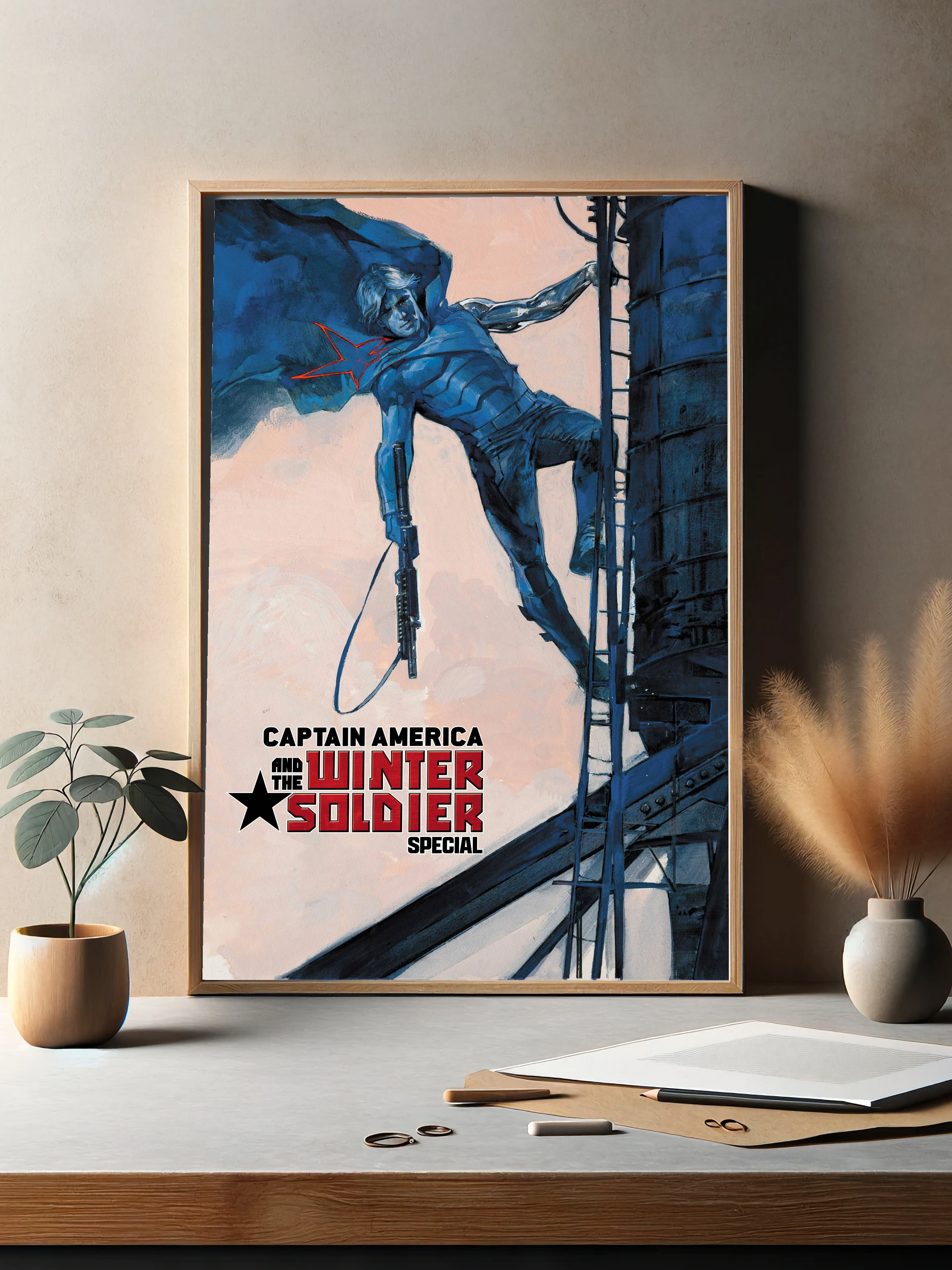 Изображение представляет собой художественный плакат с персонажем Зимним солдатом из вселенной Marvel. Он изображён на фоне индустриальной лестницы, в динамичной позе с винтовкой в руках. В центре композиции доминируют глубокие синие оттенки с контрастом красной звезды на плече. Этот интерьерный постер отлично подходит для оформления гостиной или офисного пространства поклонников комиксов и современного искусства для стен.